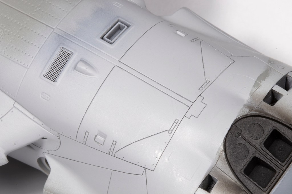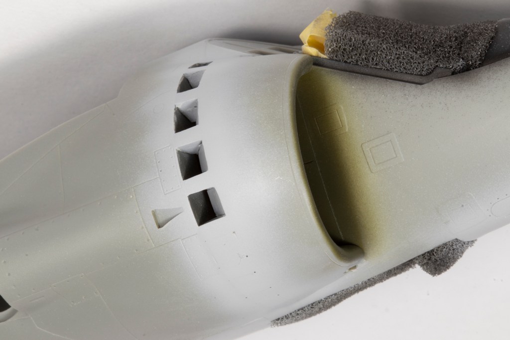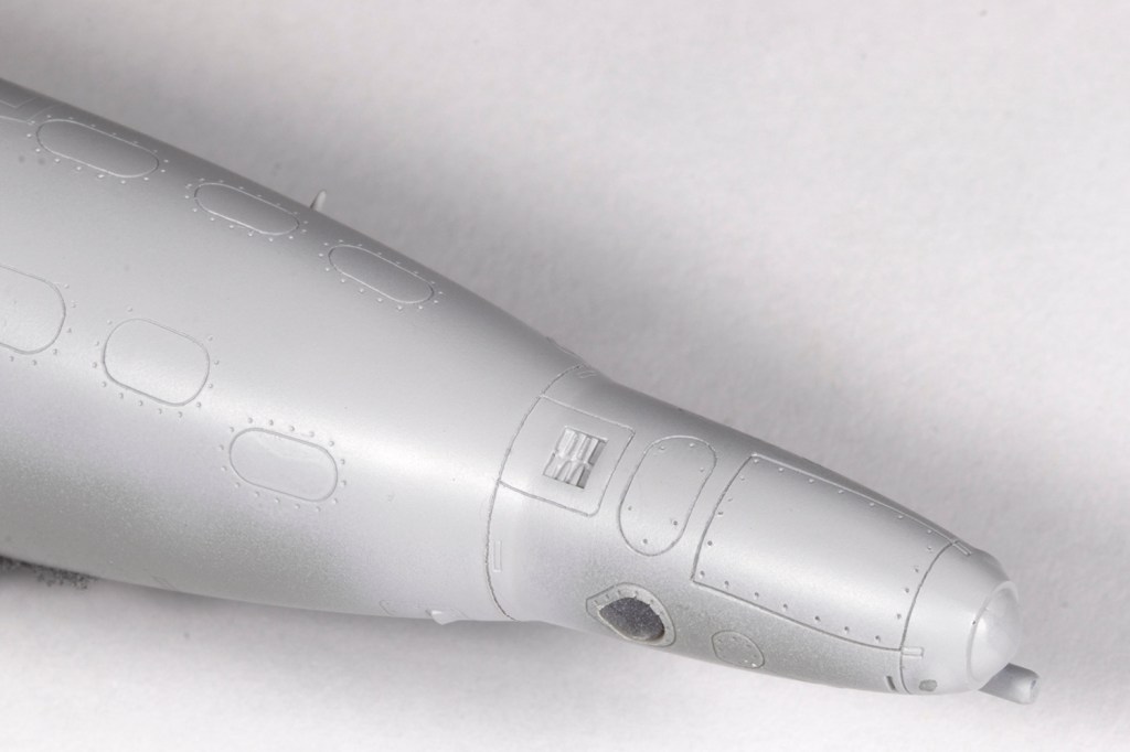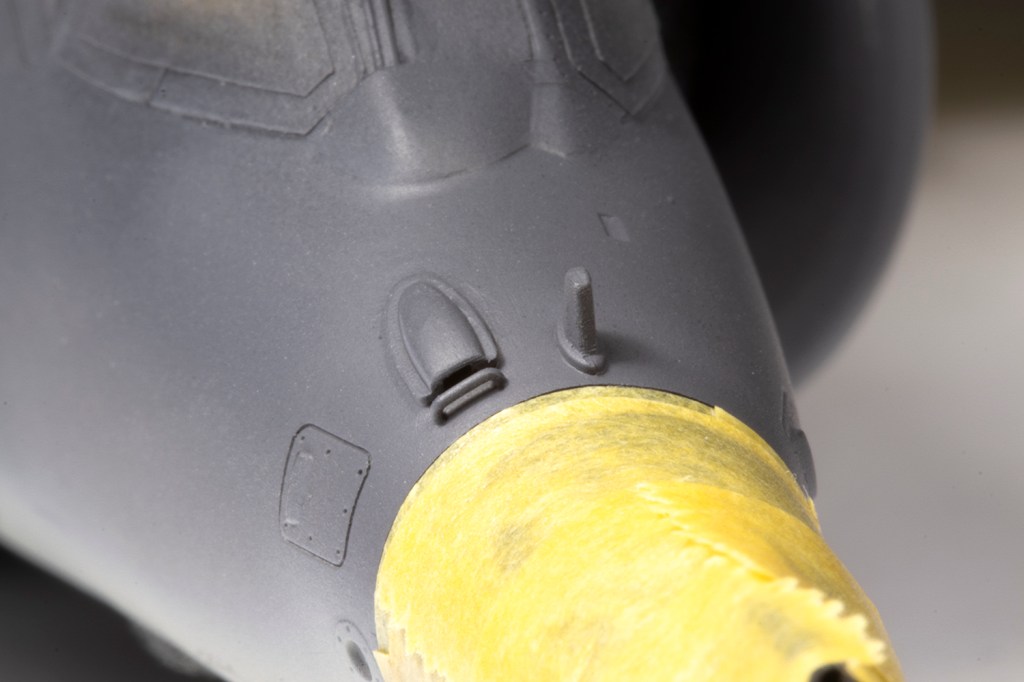 With the fuselage essentially complete, I needed to rescribe the panel lines near all the joints. My goal here, however unattainable it may seem, is to make the rescribed areas indistinguishable from the moulded detail. This is a difficult task which I’ve found easier by adopting the following method. With the joints all addressed, I primed the areas to be rescribed with a grey primer. This really allows me to see what I’m doing as restores the surface to a blank canvas and the rescribed lines will show up very clearly. Next, I needed to brace the model. My friend John Chung, who I consider to be the best ‘scriber’ I know of, advised nestling the model in an old T-shirt. I poo-pooed this for ages, but actually tried it on this model, and I think it’s a game-changer. The shirt allows the model to be stably rested in almost any orientation and frees both of my hands for the actual scribing. It’s critical to use the best guide for the scriber, which depends on the area. My preference is clear scribing tape, made by Madworks or HIQ Parts, which is excellent but doesn’t deform, so it can’t be used for curves or on parts with a taper, so my second choice is Tamiya Tape for Curves. Finally, I tend to use the Madworks DLC 0.1mm and 0.15mm scribers as I find them much easier to use than the multitude of other scribers I own. With all this I could scribe in the rear undercarriage doors and the panel lines around the fuselage that had been obliterated through sanding.
