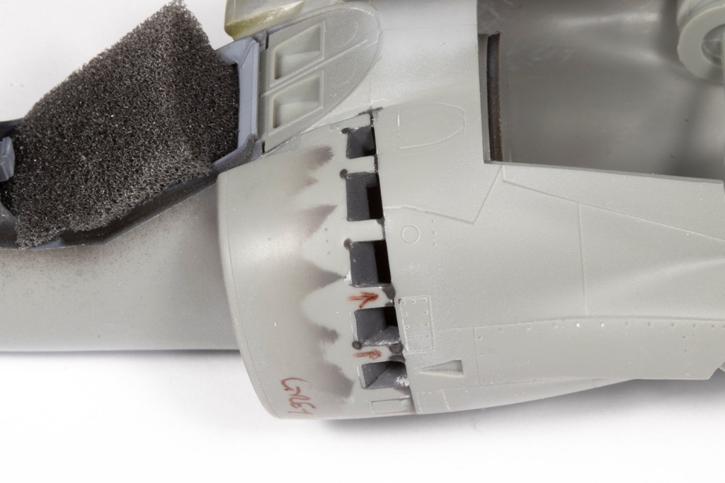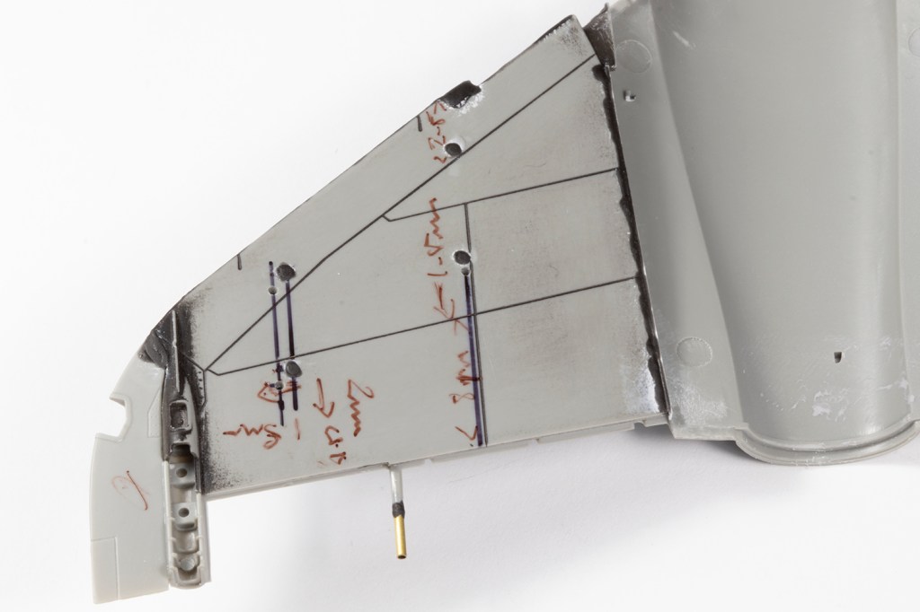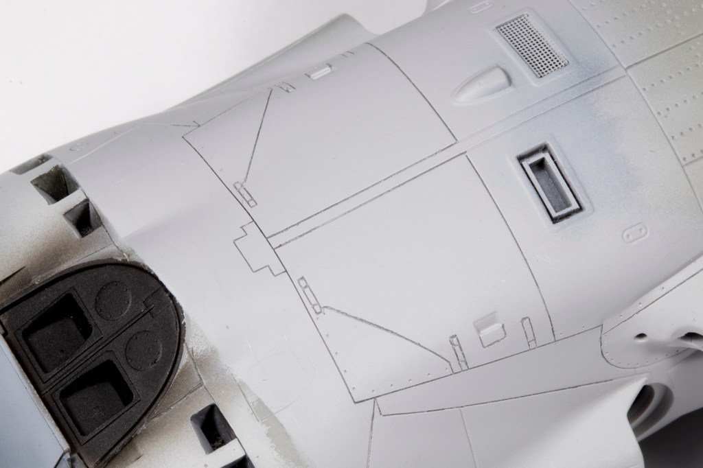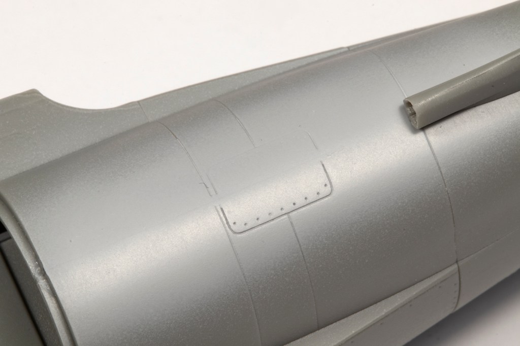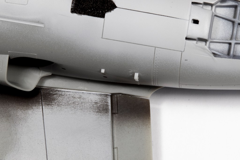 With the fuselage essentially complete, I needed to rescribe the panel lines near all the joints. My goal here, however unattainable it may seem, is to make the rescribed areas indistinguishable from the moulded detail. This is a difficult task which I’ve found easier by adopting the following method. With the joints all addressed, I primed the areas to be rescribed with a grey primer. This really allows me to see what I’m doing as restores the surface to a blank canvas and the rescribed lines will show up very clearly. Next, I needed to brace the model. My friend John Chung, who I consider to be the best ‘scriber’ I know of, advised nestling the model in an old T-shirt. I poo-pooed this for ages, but actually tried it on this model, and I think it’s a game-changer. The shirt allows the model to be stably rested in almost any orientation and frees both of my hands for the actual scribing. It’s critical to use the best guide for the scriber, which depends on the area. My preference is clear scribing tape, made by Madworks or HIQ Parts, which is excellent but doesn’t deform, so it can’t be used for curves or on parts with a taper, so my second choice is Tamiya Tape for Curves. Finally, I tend to use the Madworks DLC 0.1mm and 0.15mm scribers as I find them much easier to use than the multitude of other scribers I own. With all this I could scribe in the rear undercarriage doors and the panel lines around the fuselage that had been obliterated through sanding.