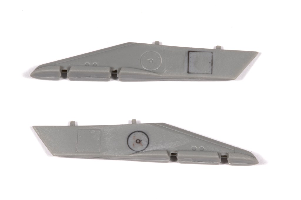 You also need to relocate the wing pylon locating holes, assuming you care about such things. The outer pylons need to go outboard by around 1.5mm and rearward by about 2mm. The inboard pylons need to be moved back around 1.5mm. I had a Black Dog Harrier Update set lying around, which is reserved for a Kinetic Sea Harrier FA.2 I intend to make, but this included some RAF inner pylons that would be unused. I used them here, but did not modify the shapes of the outer pylons – those in the kit are too short. The Black Dog set has nice details, but the moulding quality is, shall we say, dated?