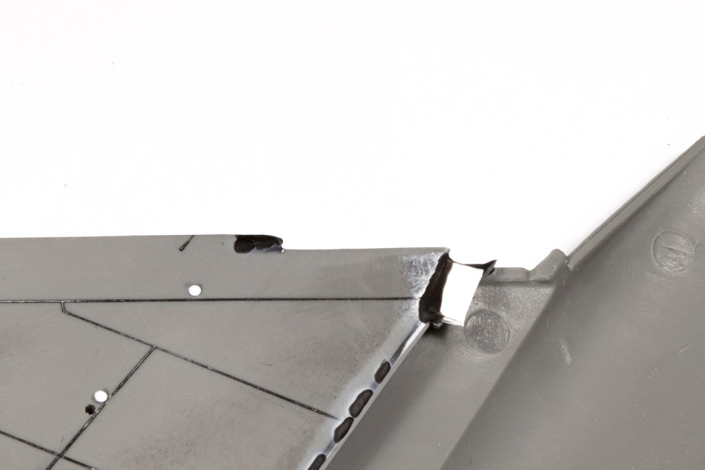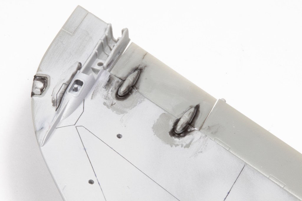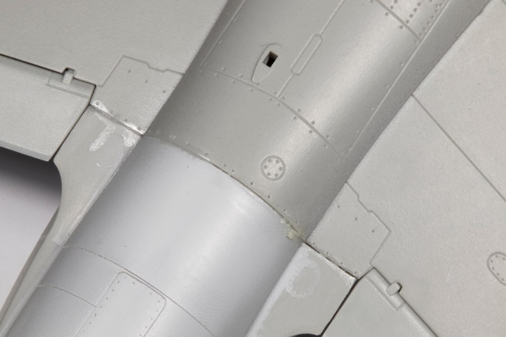 Once the filler had set, which with CA isn’t long, I could set to on it with lots of various sanding implements. I knew I’d end up eliminating quite a lot of the recessed detail, but with the method outlined above and VMS Black CA and Filler Powder used as the filler, I was confident I could rescribe it well enough. It took a couple of rounds of filler and sanding to get perfectly smooth transitions across the wing/fuselage joints, but it was easier than I feared.