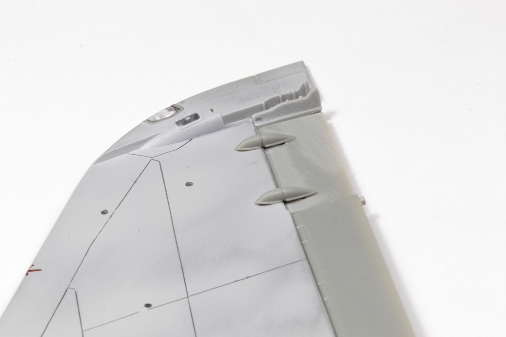 We’re not done with the wings yet, as separate control surfaces are provided. I know most modellers love them; I just wish they were moulded neutral since that’s how I prefer my planes (unless they were always deflected when at rest, like on a Hornet). It’s not a problem if they fit well, but here they don’t: the wings are way too thick at the trailing edge compared to the ailerons and flaps. ‘Aha!’ I thought, ‘I don’t really care about that, as long as they are level on the top!’ I did put a little elbow grease into thinning the trailing edge parts until I got bored and then in my haste just glued the wing halves together. And then my error became clear: because of the step from the wing to the aileron lower surface, the actuators don’t fit. At all – and never mind the missing locating holes for the moulded pegs! I resorted to a lot of filler to smooth the actuators in, but next time I’ll just have to do it properly and thin the wings much, much more. Final additions were some brass tubing slipped over the plastic fuel jettison pipes and the wingtip lights, which are a very poor fit and thus could not be left to the end, but were blended in with superglue during construction.
