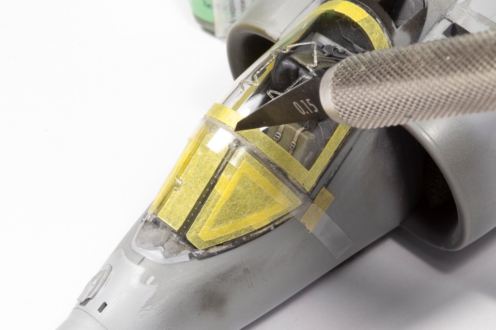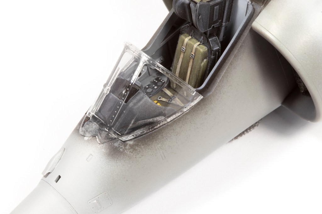 Final areas to deal with prior to paint were the canopy and guns. If you like your canopy open, you will rejoice at the wonderful fit of the parts. If, like me, you insist on canopies closed (aircraft look so much nicer this way!), you’ll curse Kinetic for getting it close, but not close enough. In order to prevent a gap between the main section and the fixed windscreen, I had to move the latter aft slightly, creating a gap at the front of the windscreen. This was filled with repeated applications of Mr Surfacer 500 and then all the joints removed with filler and the canopy shut lines scribed in. The main problem with modelling closed canopies is sealing the interior, and I failed to do so: very fine dust has contaminated the inside surfaces of the clear parts, and there’s nothing I can do about it… I used New Ware masks, which fitted very well.