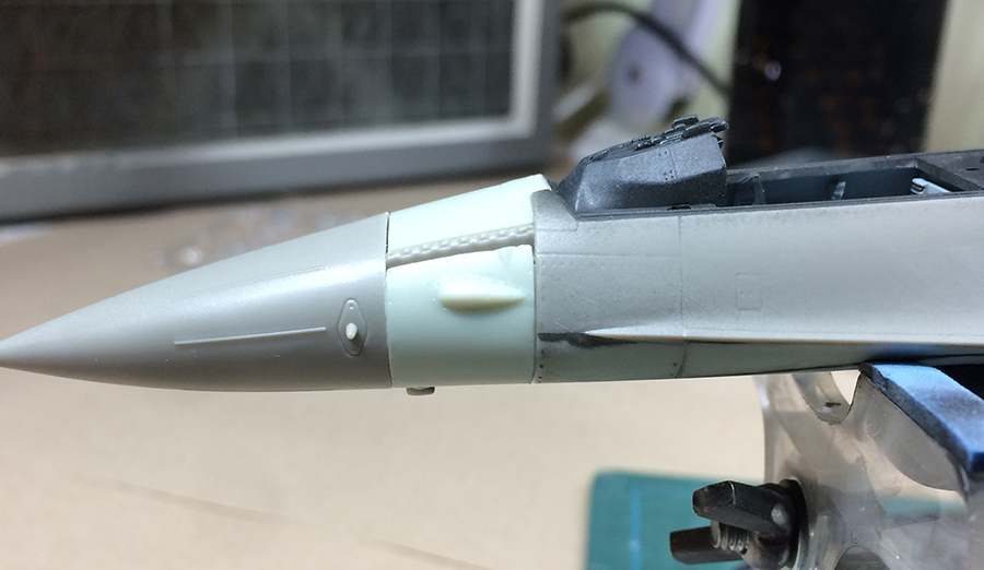 - The main intake has navigation lights mounted on moulded pedestals. These pedestals should not be present and so I removed them by sanding them off. Furthermore, the lights are too high up the intake side. I did not notice this until decalling.