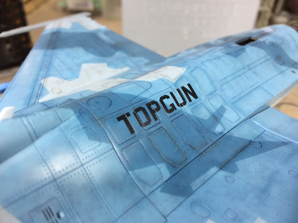 Since I did not like the ‘TOPGUN’ marking, I scanned it into Inkscape and cut my own mask using a Silhouette cutter. It was easy enough to horizontally compress the O, P, G and N by 0.5mm or so, but the N was more work.
