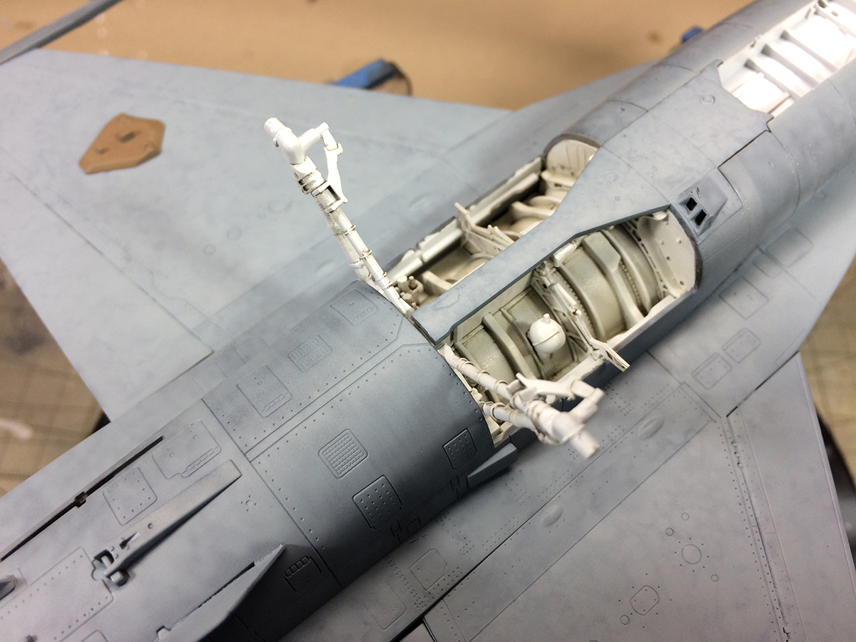 The blues are the matching FS shades from MRP. This aircraft is usually photographed in bright sunlight and the colours are very vivid and the blues quite saturated, especially the light blue. The MPR shades are more muted and the grey looks a bit dark. The real thing had a lot of touch up paint over all three of the upper surface colours. I attempted to replicate this with some airbrushing in the relevant areas with darkened shades of the base colours. On at least one of the photos, the starboard wing pylon appeared to have been taken from a brown camouflaged machine, and so this was painted with Hataka’s FS30219. The pylons should have some serial numbers on them, but I couldn’t find anything suitable to use for these.