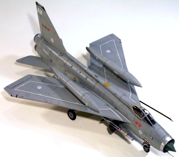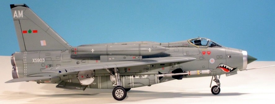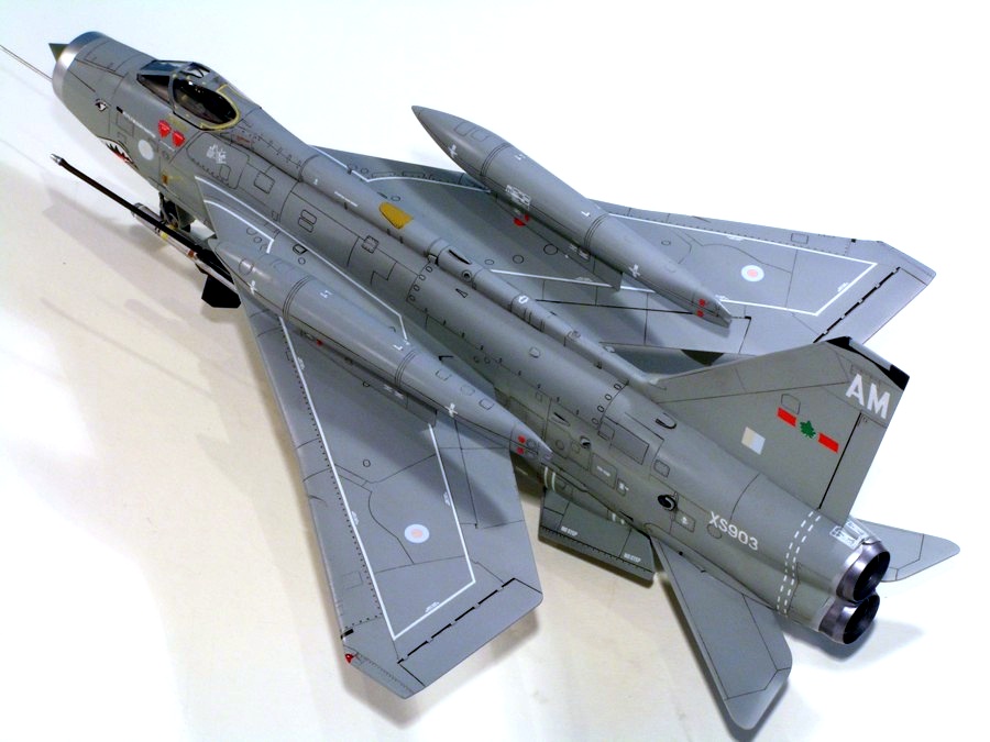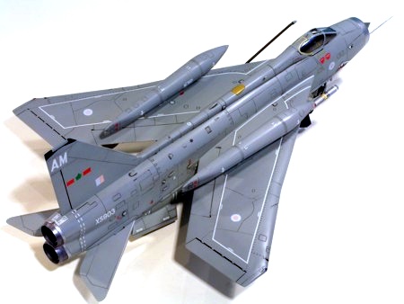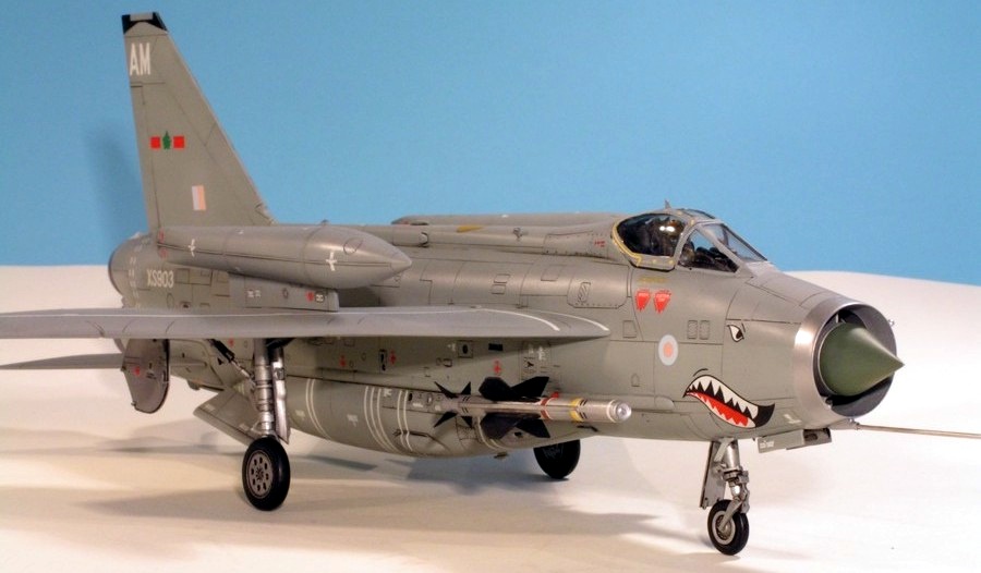 Following the Lightning F.1, which was the earliest version of the Lightning, I built the Airfix kit of the latest version: the F.6. As with the F.1, this kit is beautiful and went together very easily. I added the Airwaves photo-etch detail set, which to be honest was useless and fitted very poorly. The only worthwhile components it provided were the missile fins and the small triangular aerials. An Airwaves resin seat was used, which is very nice. Kit decals were used; they’re okay, but silvered a bit as I hadn’t yet managed to get any Microsol. The decals on the port side have faded quite badly in the showcase. Paint is good old Humbrol with Alclad II on the nose ring and aluminium exhaust ring. The nose pitot was replaced with brass tube and wire, and the plane armed with Red Top missiles.