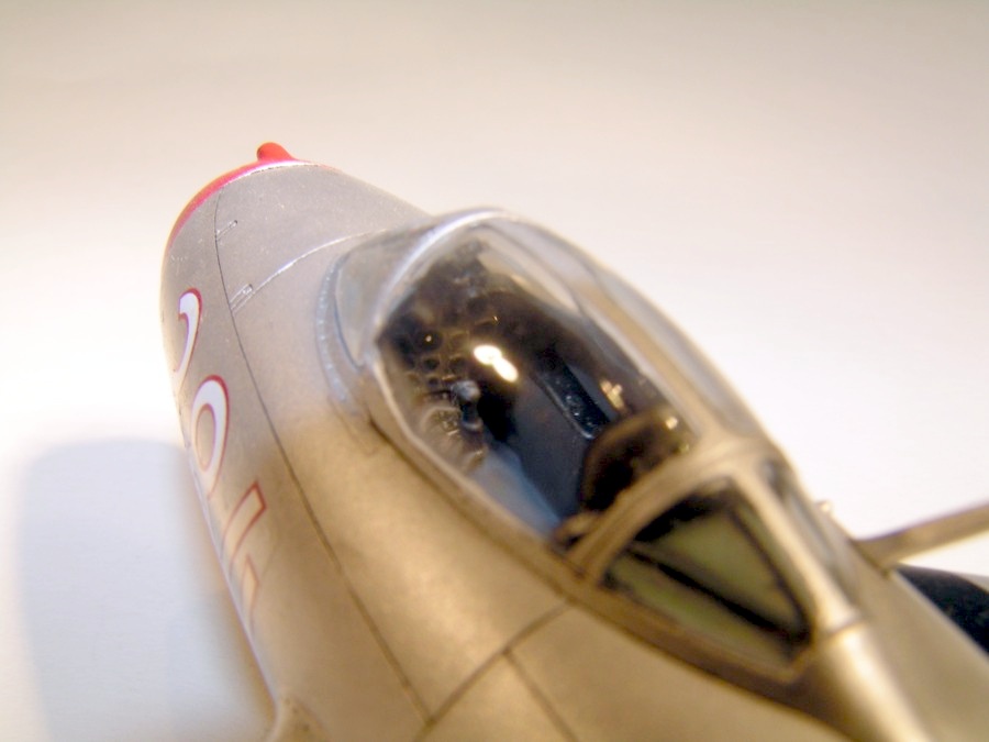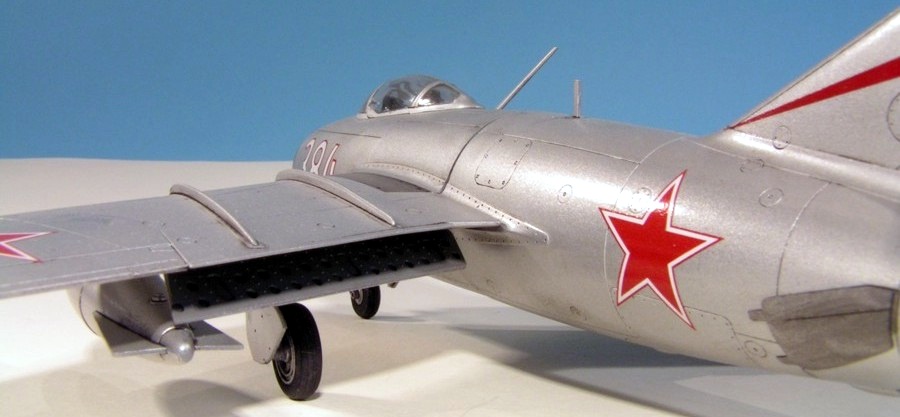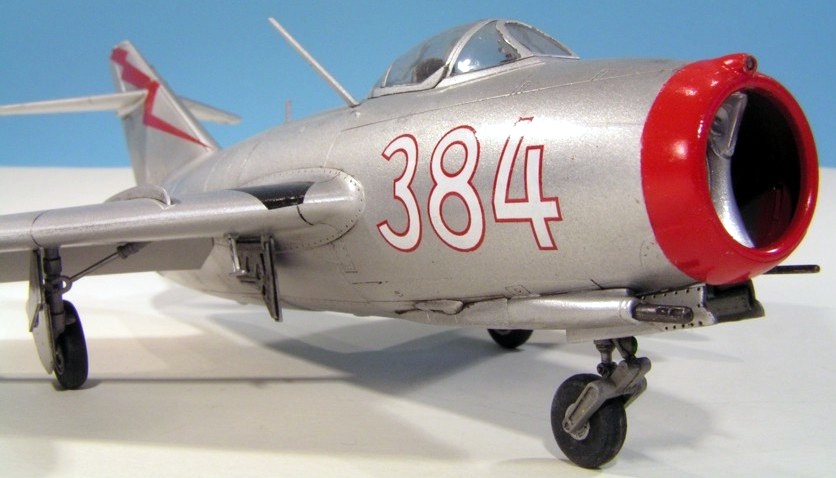 Tamiya’s MiG-15bis ‘Fagot’ is a really nice kit. I built it very quickly, so it should look a lot better than it does. No aftermarket stuff was used. The finish is Humbrol Metalcote Polished Aluminium with an oil wash over the top. The decals are from the kit and are very thin and extremely fragile — that’s why the fin flash looks tatty. The only problem I experienced was that the rear fuselage did not fit well over the jet engine, hence the massive gap between the front and rear fuselages. If I were to build this kit again I would omit the engine and make sure the fuselage halves joined up properly.