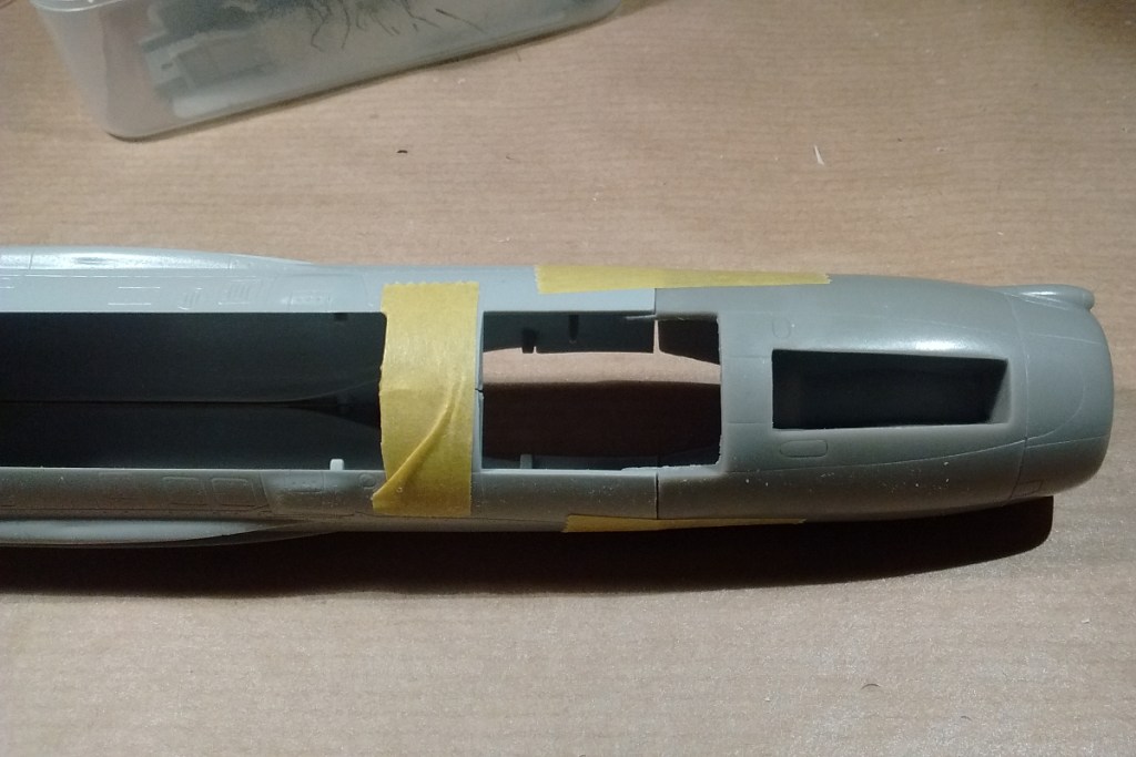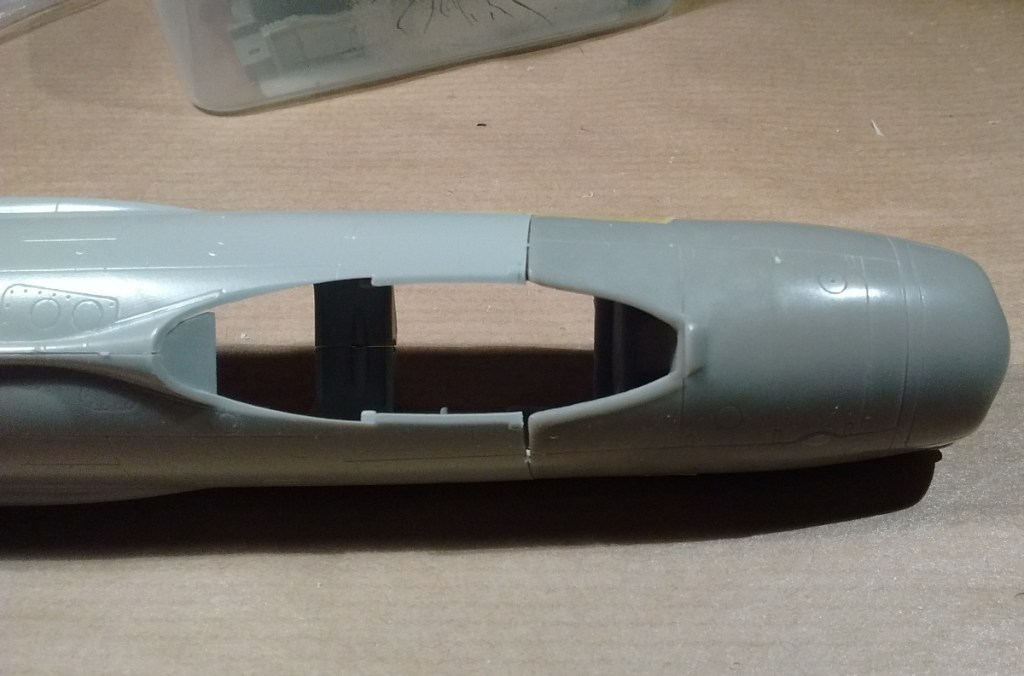 The kit cockpit is surprisingly busy. SBS Model also make a resin version compatible with the nose, but I was going to close the canopy and so passed on that. I ignored the instructions and painted almost everything Tamiya XF-53. The final result is not brilliantly accurate, but then it’s not really visible either. The cockpit can be inserted after the nose is attached, so my focus switched back to the fuselage.