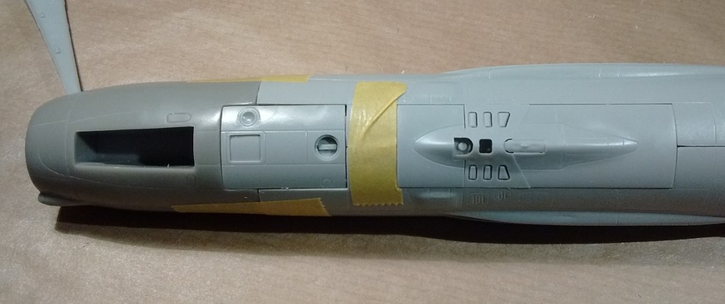 - A lot of the surface detail on the fuselage is fictitious or missing. In particular, the blow-in doors on the upper mid-fuselage are not there; you can see them clearly enough on the box art and markings diagram. I scribed them in using a template from Dream Model. I wished I discovered this earlier as I’d already attached the various fuselage intakes which got in the way.
