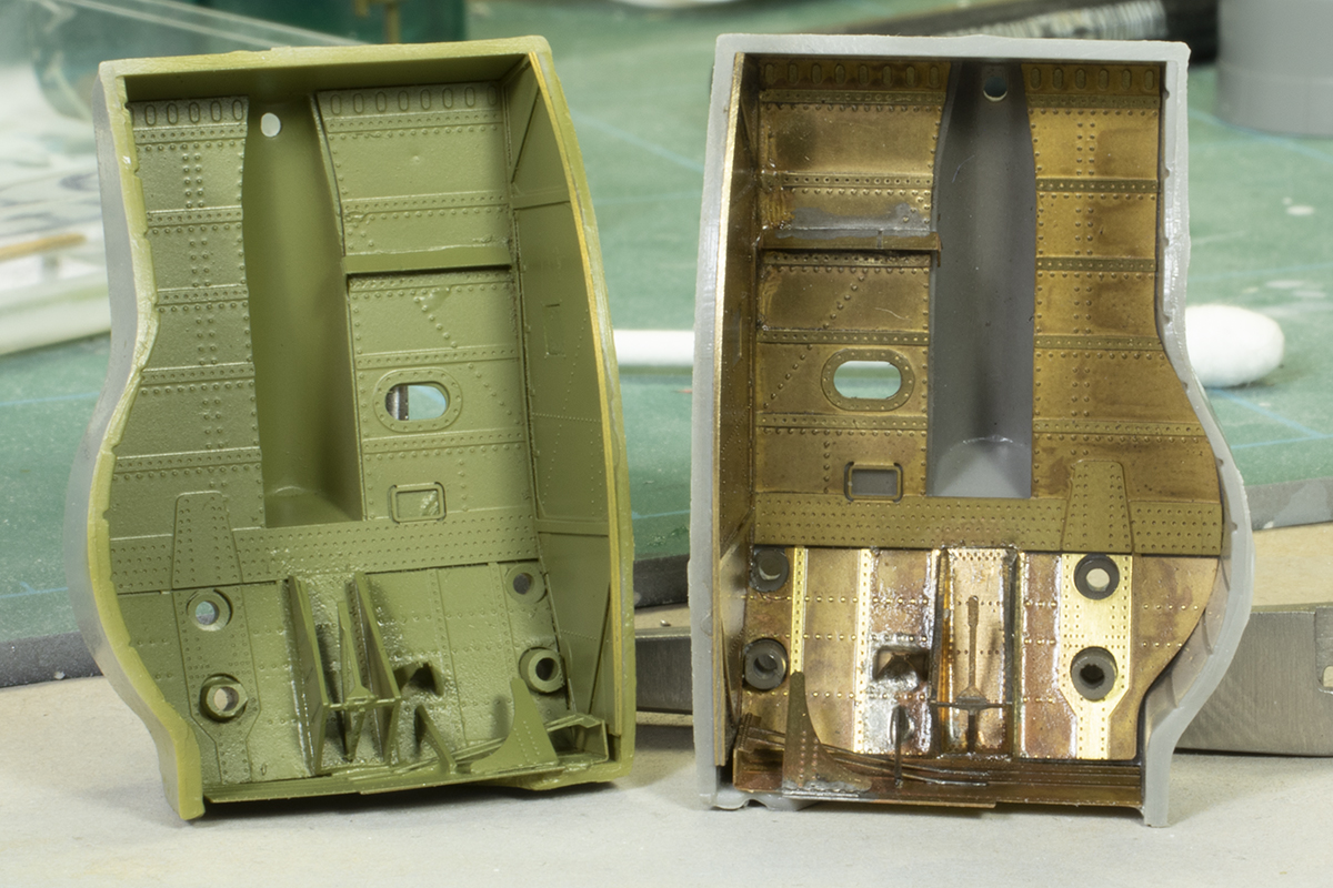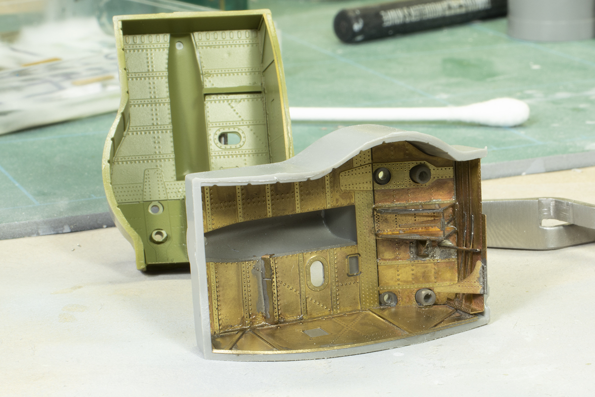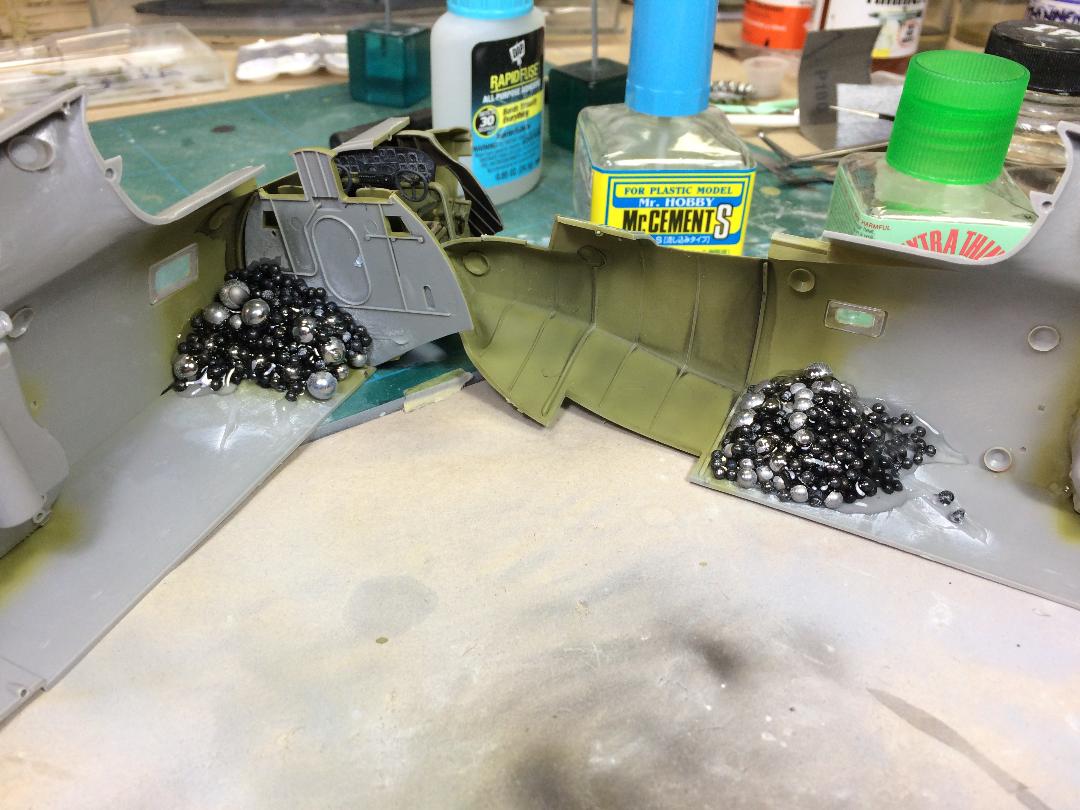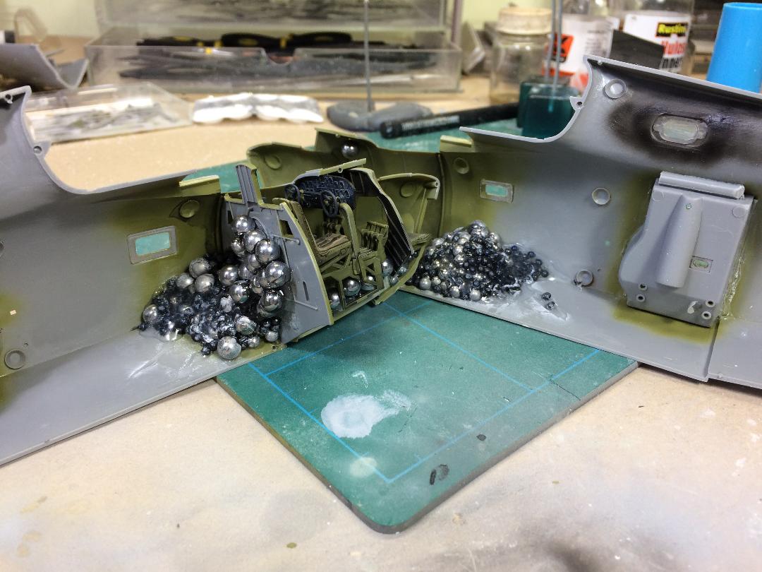 In the end, the nose turret area got filled with more steel and lead, painted black, and I am relying on the very limited visibility through the turret windows to not worry about it. Behind the rear cockpit bulkhead I added a fake shelf to prevent the weights there being seen through the rear windows.