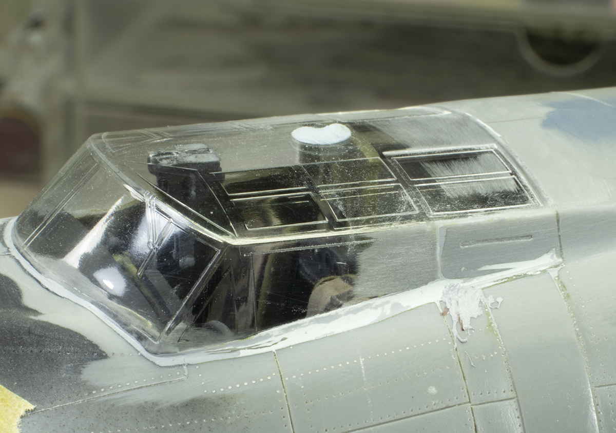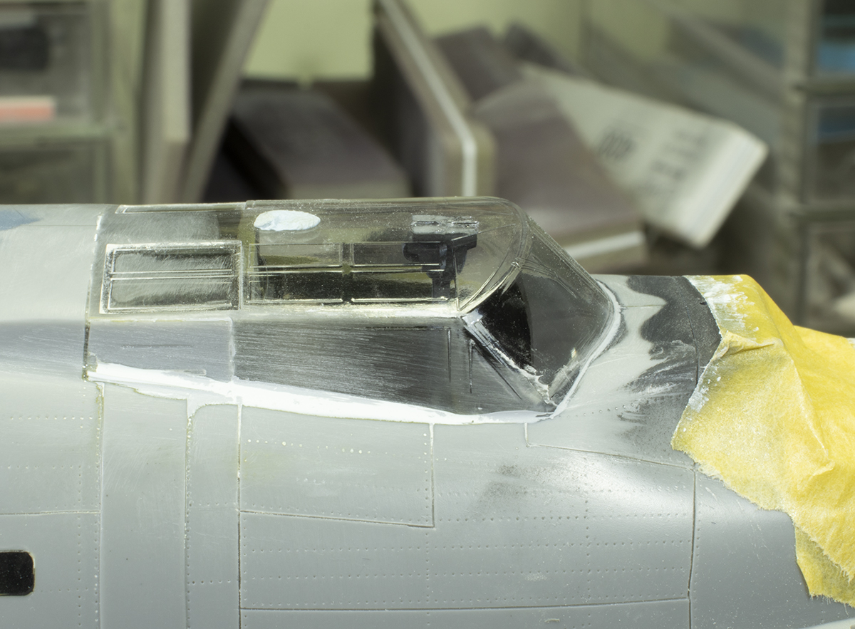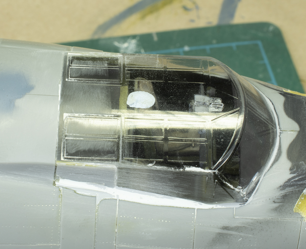 The main canopy was way narrower than the fuselage, which posed a big problem. I even considered cutting it down the centre. In the end, I didn’t follow through with that mad plan and resorted to good old Milliput, Mr Surfacer 500 and CA to blend the sides of the canopy in. I did, however, butcher the fuselage where canopy joins at the rear three-quarter area to make the joints easier to address.