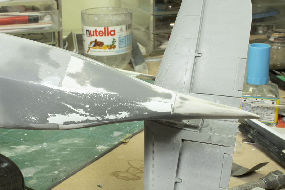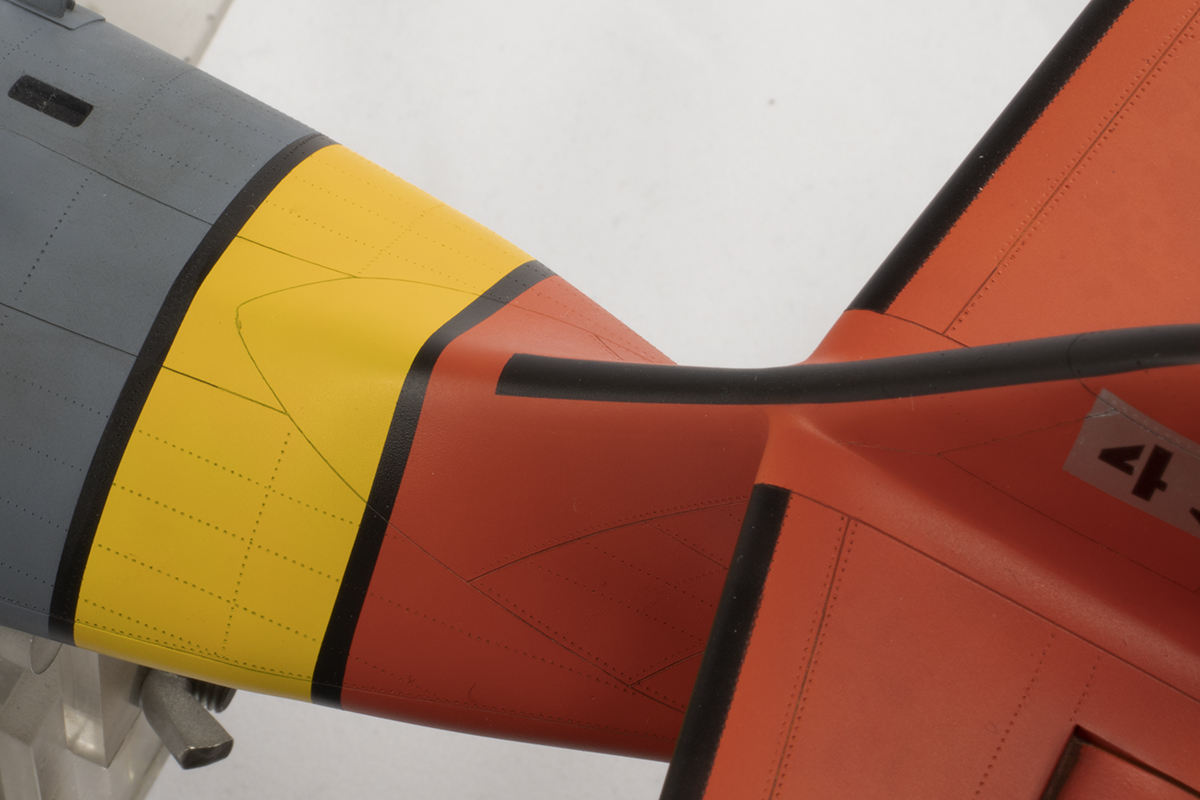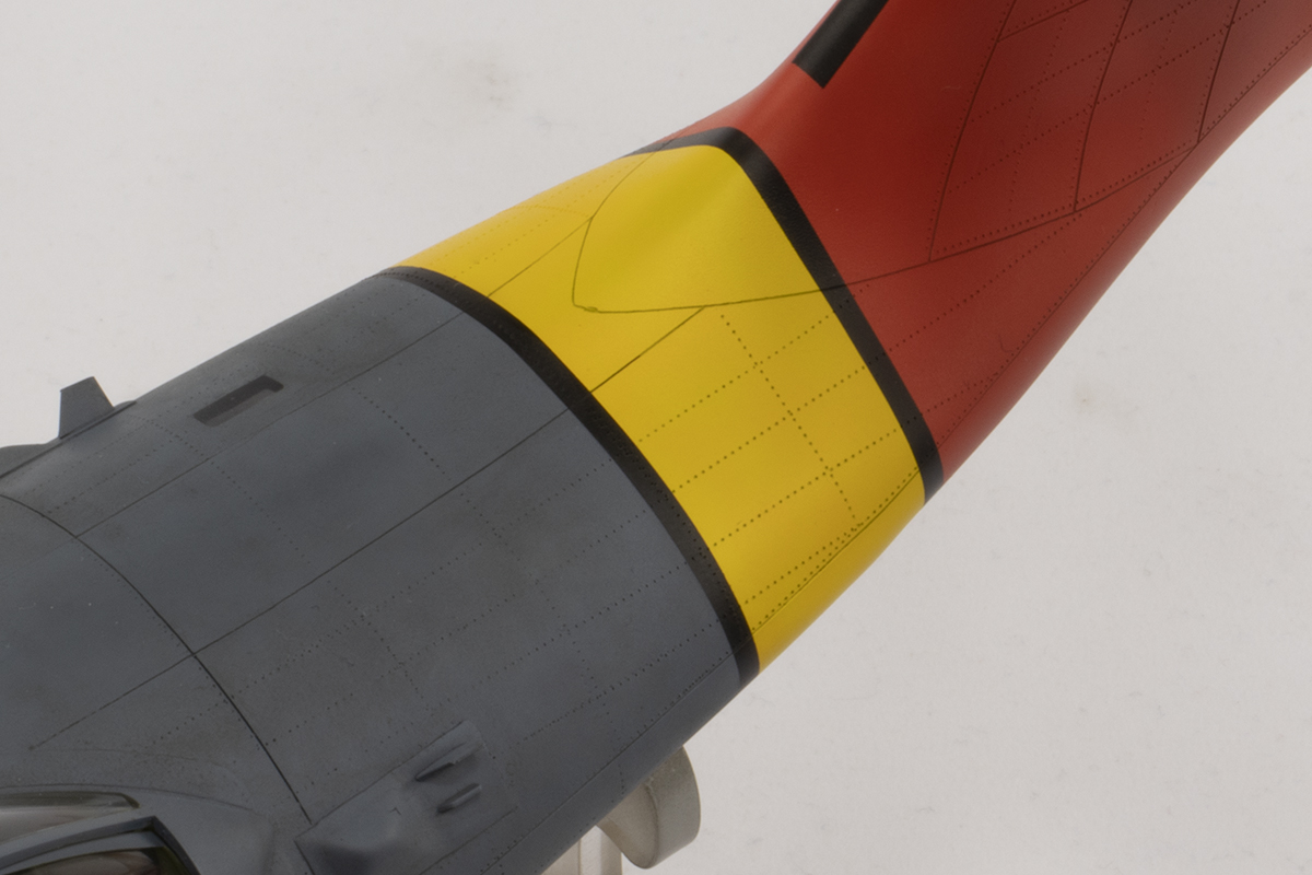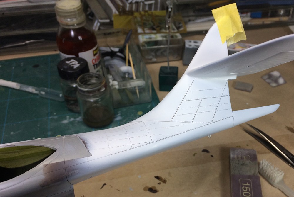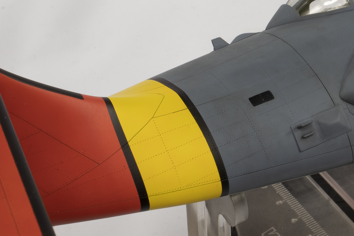 The surface detail on the resin tail does not really match the quite fine and riveted detail on the kit. I eliminated it all and then pondered how to make it match, since rescribing into hard resin and CA was not going to be fun. In the end I plumped for what I call the intermediate Paul Budzik method, which is to scribe into primer, and not the underlying material. (The advanced method is to scribe into the finished paint!) I therefore sprayed the rear of the model with generous amounts of Mr Primer Surfacer 1000, followed by Mr Mahogany Surfacer 1000 and then Mr Finishing Surfacer 1500 White, all through an Iwata RG-3. That meant there was a lot of primer. With a needle, I scribed through the white primer revealing the brown primer underneath using Tamiya white flexible masking tape as a guide. This was not ideal, as the tape deforms easily under pressure. The resulting detail is a bit wobbly and rough when viewed close up, but I was happy enough. I then attempted some riveting using a wheel from RB Productions and learned my hand is not as steady as I thought it was. I should have used a guide and marked it all out properly in pencil first; the rivet lines are all over the place.