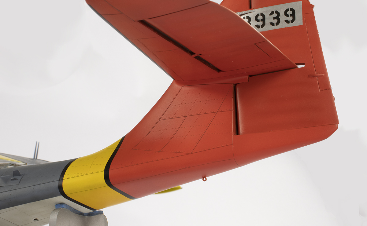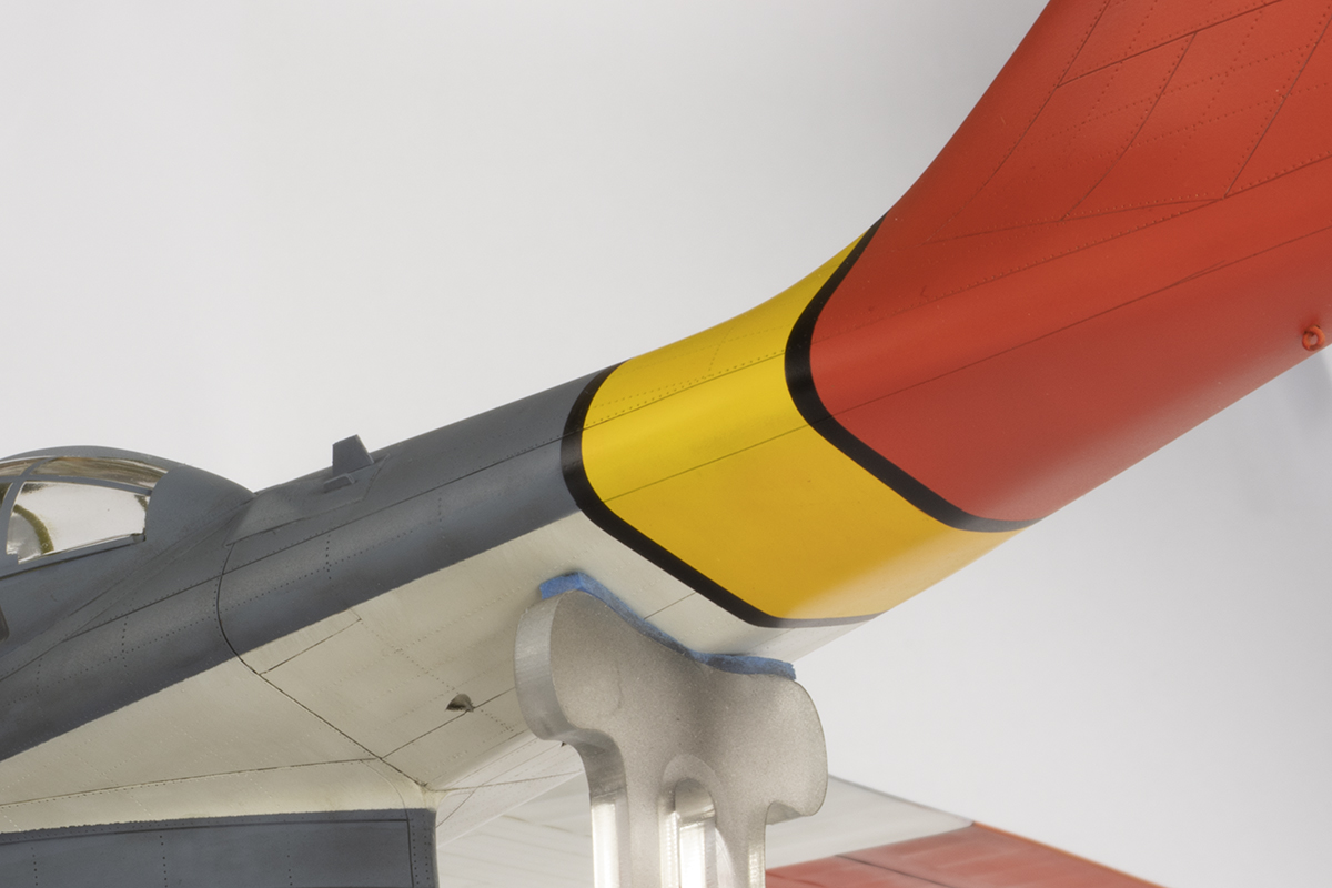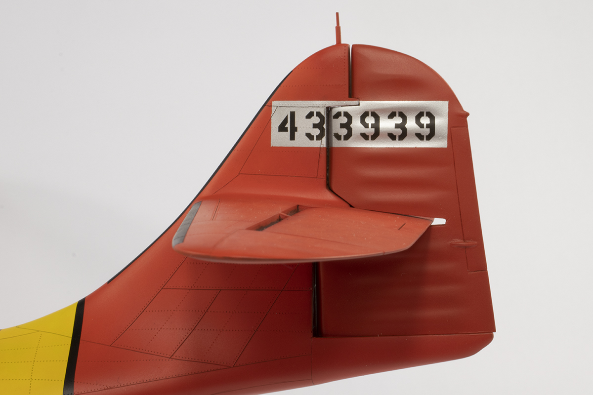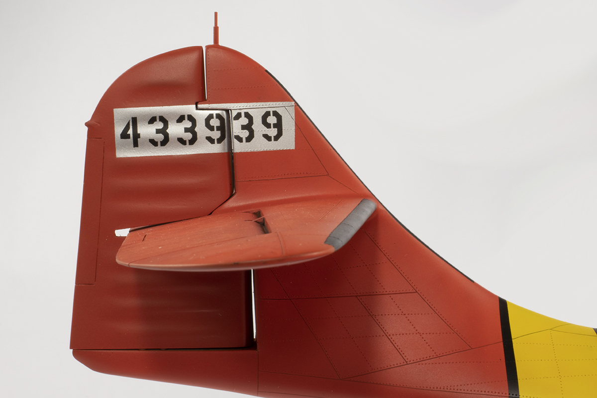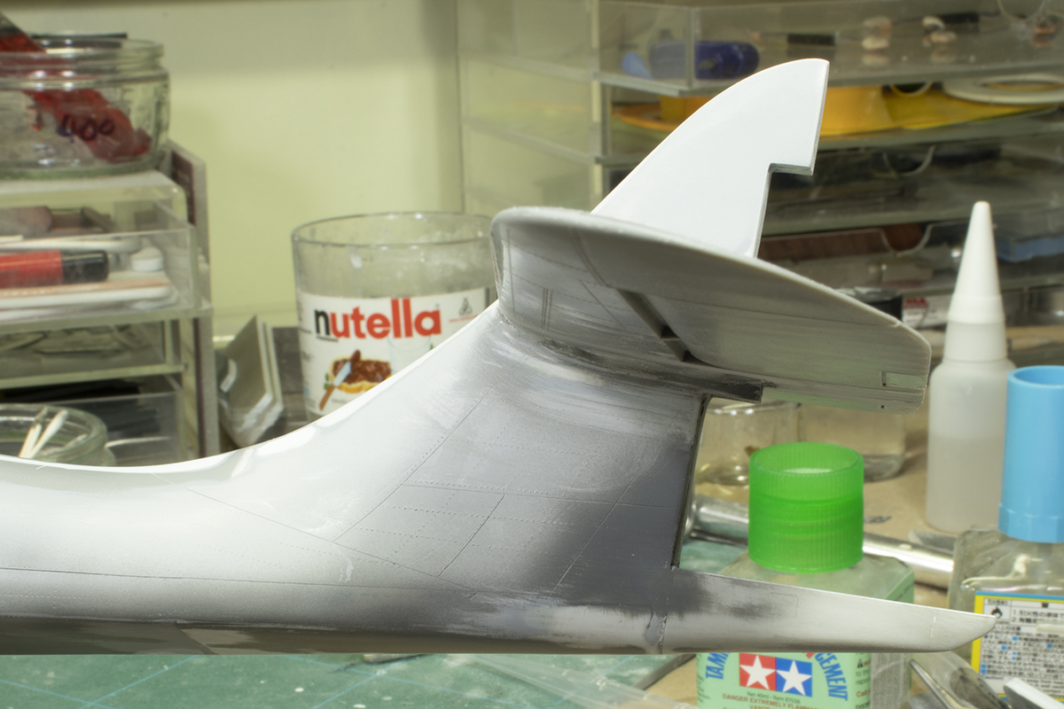 The surface detail on the resin tail does not really match the quite fine and riveted detail on the kit. I eliminated it all and then pondered how to make it match, since rescribing into hard resin and CA was not going to be fun. In the end I plumped for what I call the intermediate Paul Budzik method, which is to scribe into primer, and not the underlying material. (The advanced method is to scribe into the finished paint!) I therefore sprayed the rear of the model with generous amounts of Mr Primer Surfacer 1000, followed by Mr Mahogany Surfacer 1000 and then Mr Finishing Surfacer 1500 White, all through an Iwata RG-3. That meant there was a lot of primer. With a needle, I scribed through the white primer revealing the brown primer underneath using Tamiya white flexible masking tape as a guide. This was not ideal, as the tape deforms easily under pressure. The resulting detail is a bit wobbly and rough when viewed close up, but I was happy enough. I then attempted some riveting using a wheel from RB Productions and learned my hand is not as steady as I thought it was. I should have used a guide and marked it all out properly in pencil first; the rivet lines are all over the place.