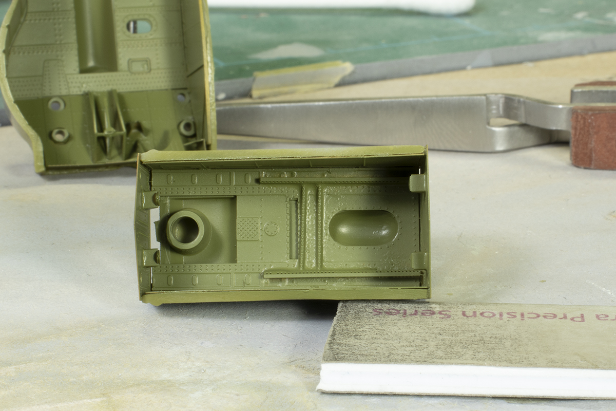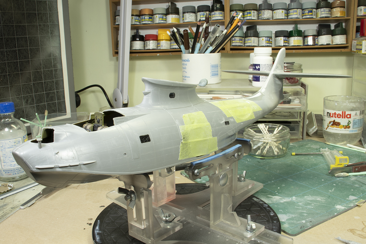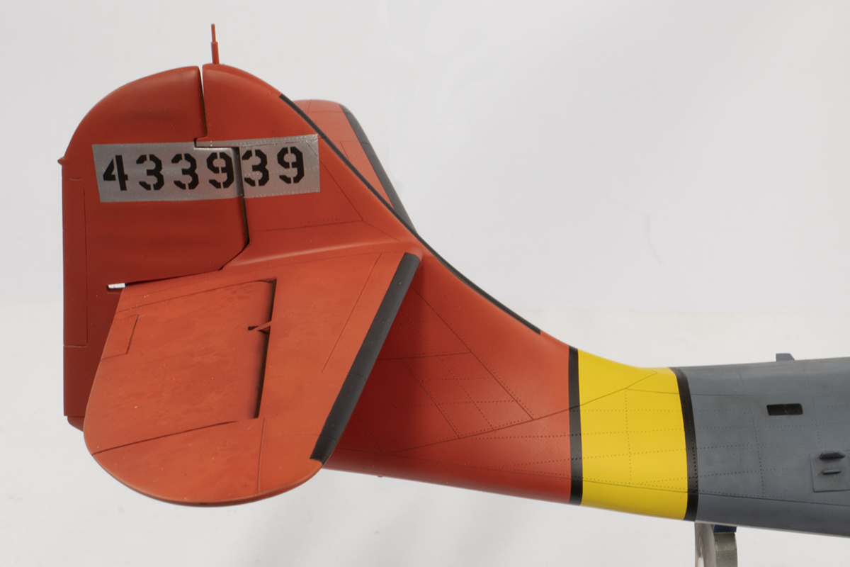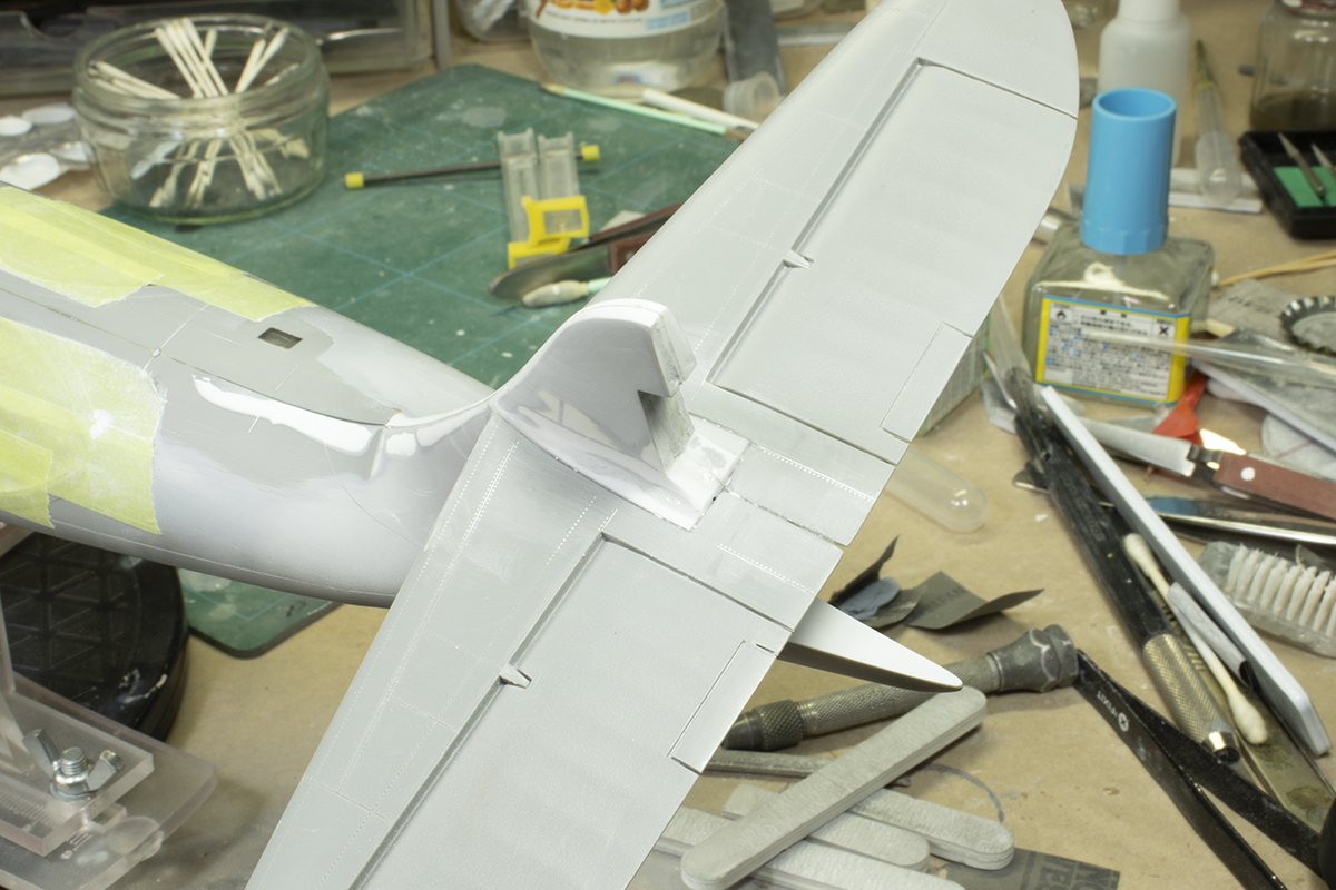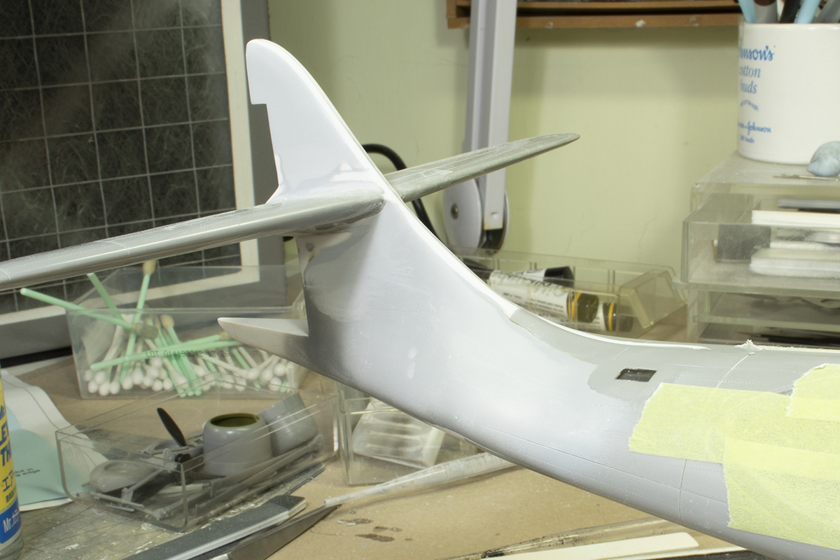 The surface detail on the resin tail does not really match the quite fine and riveted detail on the kit. I eliminated it all and then pondered how to make it match, since rescribing into hard resin and CA was not going to be fun. In the end I plumped for what I call the intermediate Paul Budzik method, which is to scribe into primer, and not the underlying material. (The advanced method is to scribe into the finished paint!) I therefore sprayed the rear of the model with generous amounts of Mr Primer Surfacer 1000, followed by Mr Mahogany Surfacer 1000 and then Mr Finishing Surfacer 1500 White, all through an Iwata RG-3. That meant there was a lot of primer. With a needle, I scribed through the white primer revealing the brown primer underneath using Tamiya white flexible masking tape as a guide. This was not ideal, as the tape deforms easily under pressure. The resulting detail is a bit wobbly and rough when viewed close up, but I was happy enough. I then attempted some riveting using a wheel from RB Productions and learned my hand is not as steady as I thought it was. I should have used a guide and marked it all out properly in pencil first; the rivet lines are all over the place.