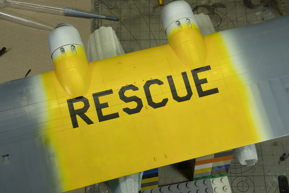 I experimented with Tamiya’s yellow masking sheet and Artool Ultramask vinyl masking material. Both have their strengths and weaknesses. The Tamiya material is very thin, and so you avoid ridges building up at the mask edges more easily, but it’s more flexible and easier to distort. The vinyl is stiffer and thicker and I could cut finer details into it. Here’s what the large RESCUE marking on the wing looked like. It’s almost 6 inches long: