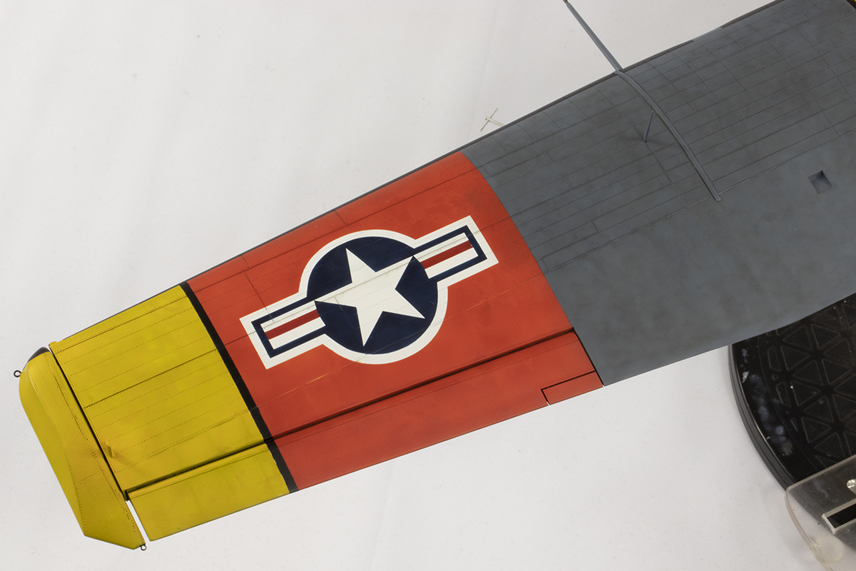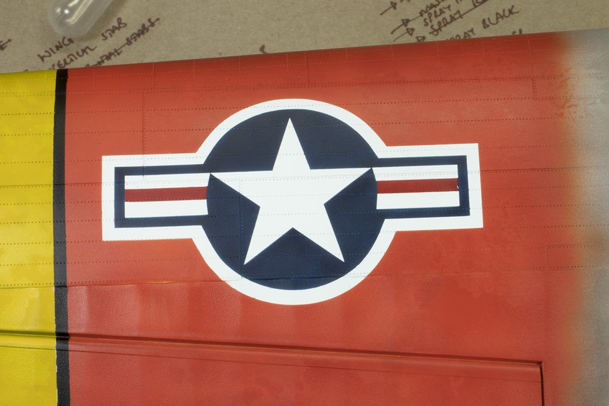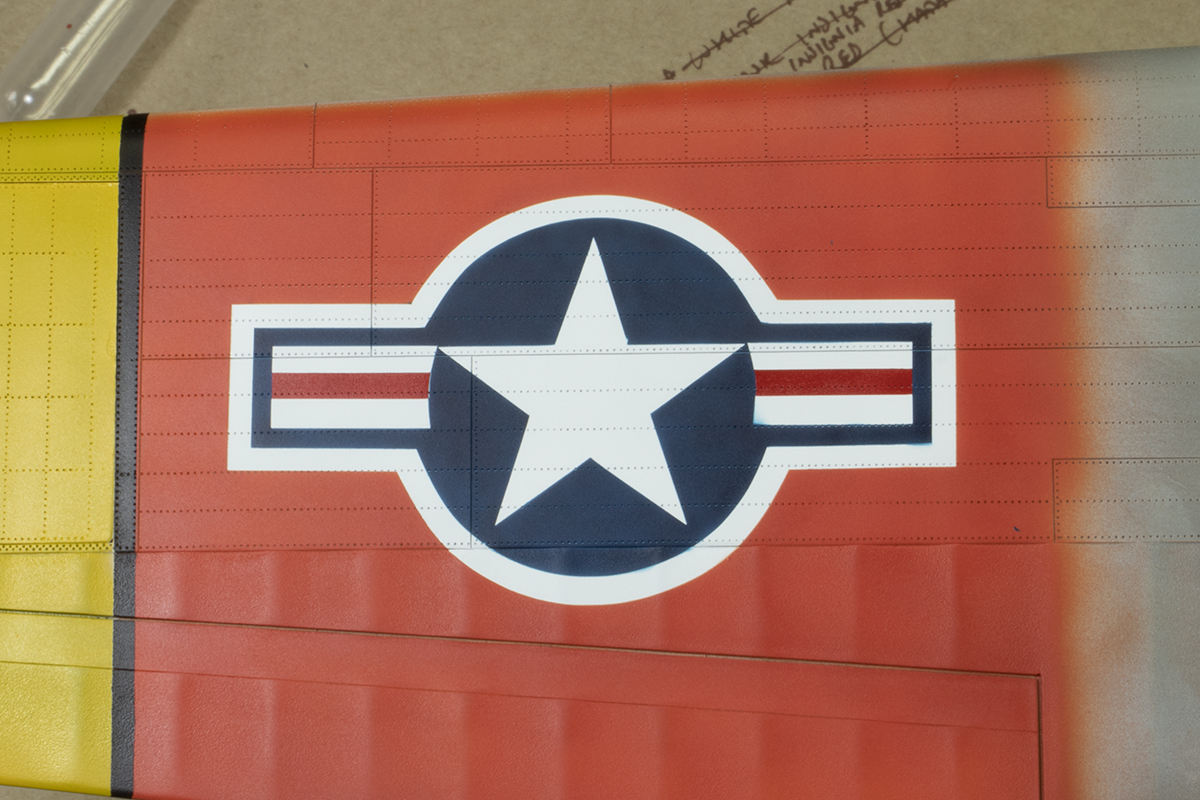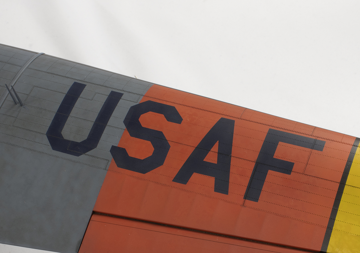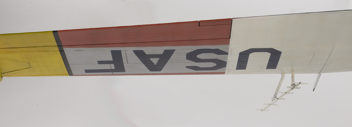 - I don’t know how the USAF marking was outlined on the red panel on the upper wing, so that’s a guess. The photos are pretty clear that on the underside of the wing that it’s against a silver background.