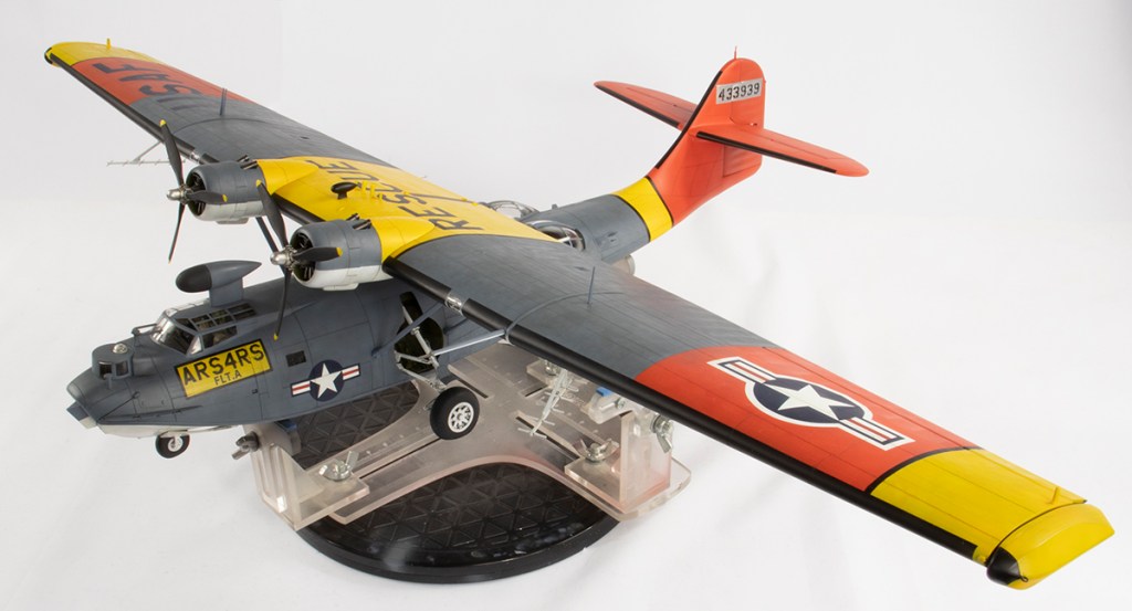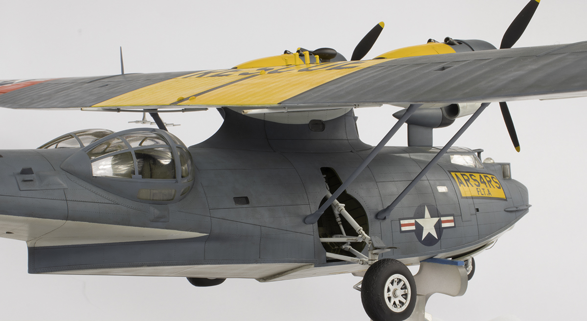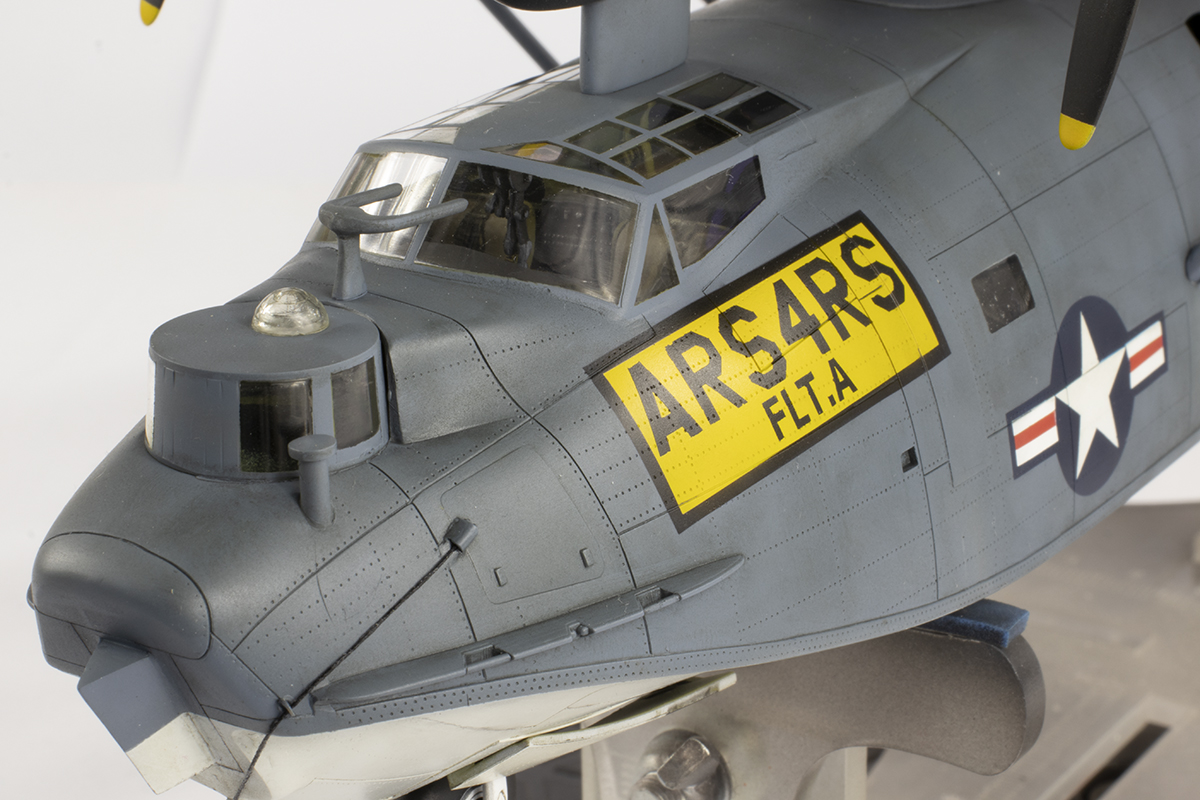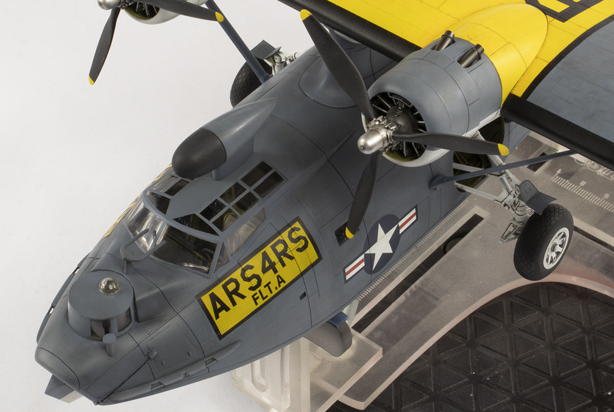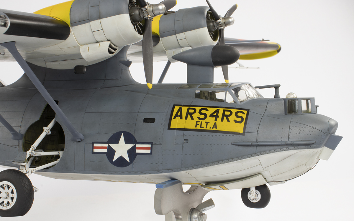 The yellow is a layered application of Mr Color 329 Yellow, 4 Yellow and MRP RAF Marker Yellow. The red is a 1:2 mix of Hataka lacquer Insignia Red and International Orange, which is ever so slightly too pink, but matches close enough what I can see in the photo I think is best exposed. The main blue/grey is Mr Color 366 Intermediate Blue. It is far from clear that this is the correct shade and I could not find definitive proof of which paint was used by the USAF on their Catalinas. The photos I had varied in colour quite wildly depending on how the same image was processed, so I just went with what seemed close enough and pleasing to my eye. In the end I think my model is too light and would have benefited from a slightly darker shade of blue. The white undersides are various applications of Mr Color 69 Off White and 316 Insignia White all over a base of Mr Finishing Surfacer 1500 White.
