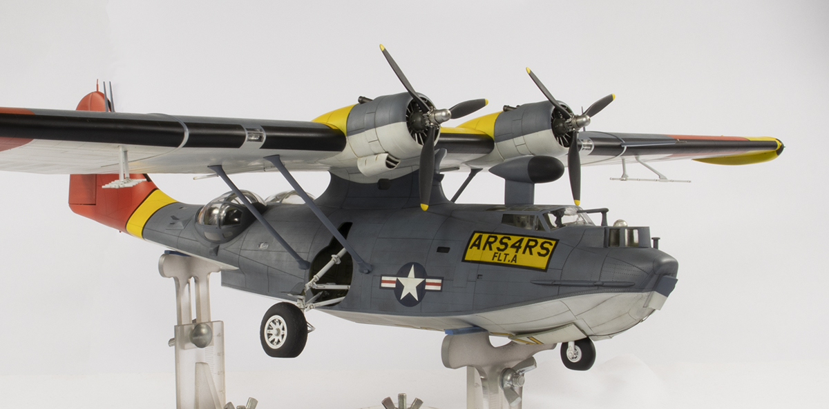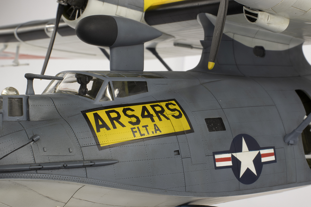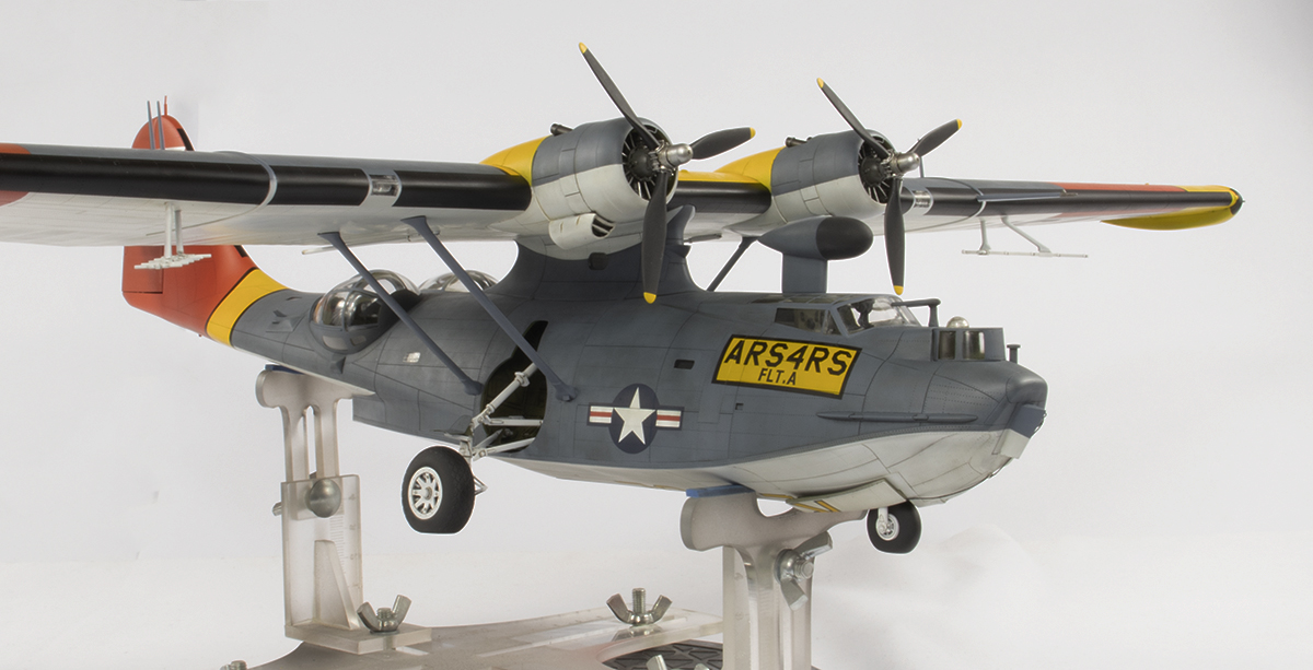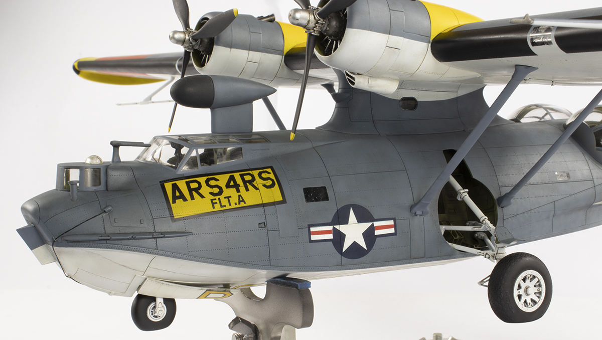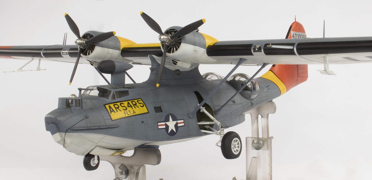 The yellow is a layered application of Mr Color 329 Yellow, 4 Yellow and MRP RAF Marker Yellow. The red is a 1:2 mix of Hataka lacquer Insignia Red and International Orange, which is ever so slightly too pink, but matches close enough what I can see in the photo I think is best exposed. The main blue/grey is Mr Color 366 Intermediate Blue. It is far from clear that this is the correct shade and I could not find definitive proof of which paint was used by the USAF on their Catalinas. The photos I had varied in colour quite wildly depending on how the same image was processed, so I just went with what seemed close enough and pleasing to my eye. In the end I think my model is too light and would have benefited from a slightly darker shade of blue. The white undersides are various applications of Mr Color 69 Off White and 316 Insignia White all over a base of Mr Finishing Surfacer 1500 White.