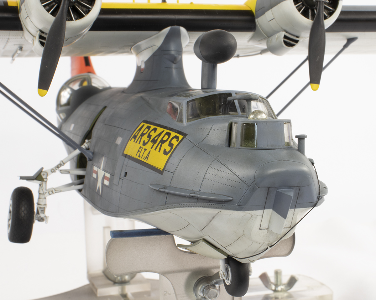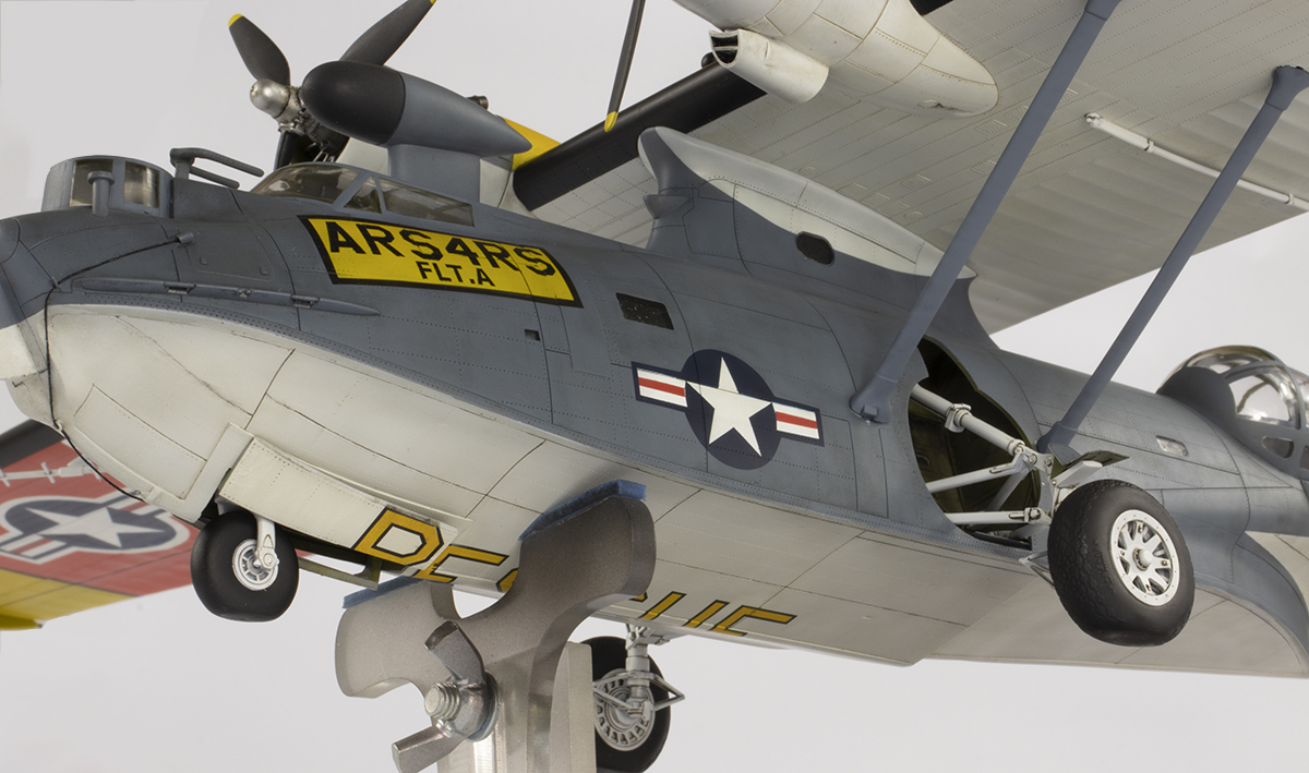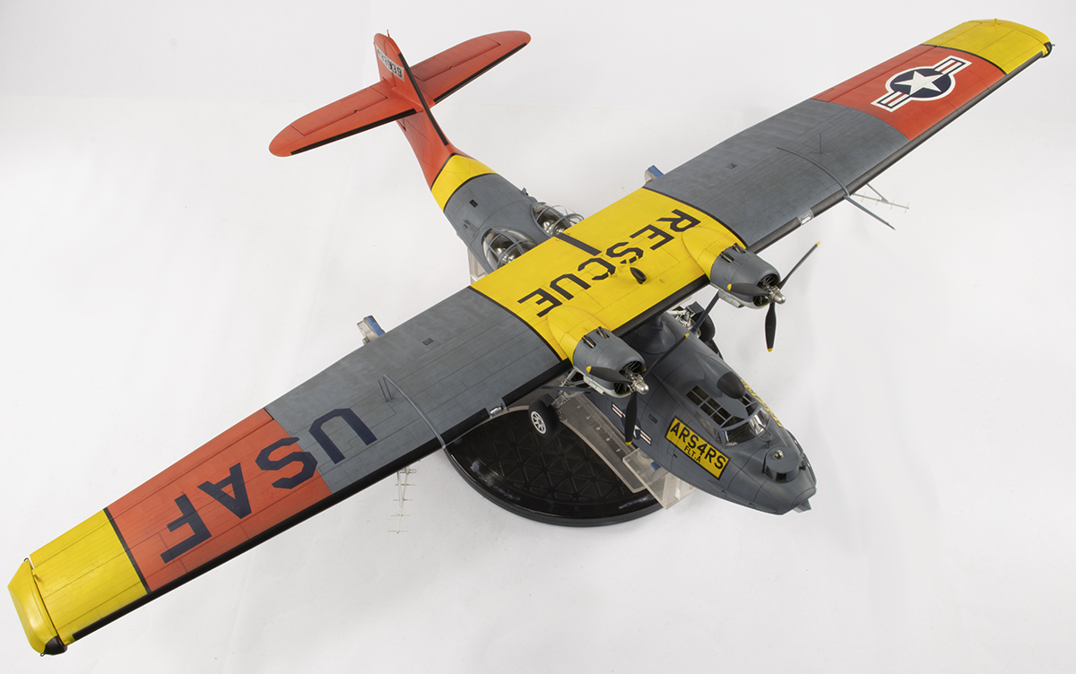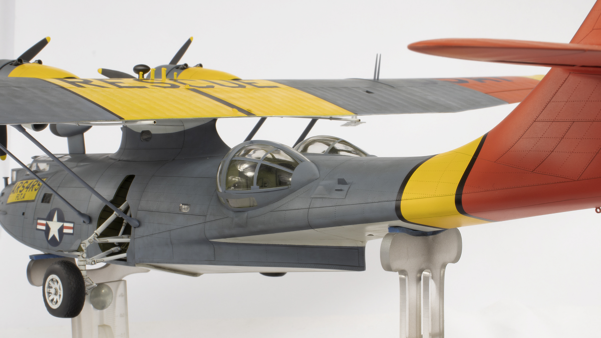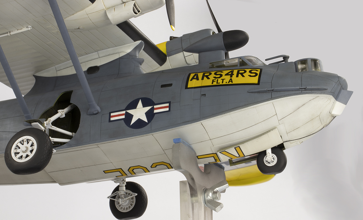 The yellow is a layered application of Mr Color 329 Yellow, 4 Yellow and MRP RAF Marker Yellow. The red is a 1:2 mix of Hataka lacquer Insignia Red and International Orange, which is ever so slightly too pink, but matches close enough what I can see in the photo I think is best exposed. The main blue/grey is Mr Color 366 Intermediate Blue. It is far from clear that this is the correct shade and I could not find definitive proof of which paint was used by the USAF on their Catalinas. The photos I had varied in colour quite wildly depending on how the same image was processed, so I just went with what seemed close enough and pleasing to my eye. In the end I think my model is too light and would have benefited from a slightly darker shade of blue. The white undersides are various applications of Mr Color 69 Off White and 316 Insignia White all over a base of Mr Finishing Surfacer 1500 White.