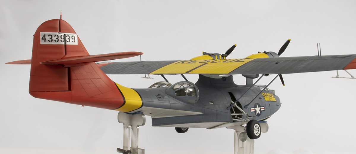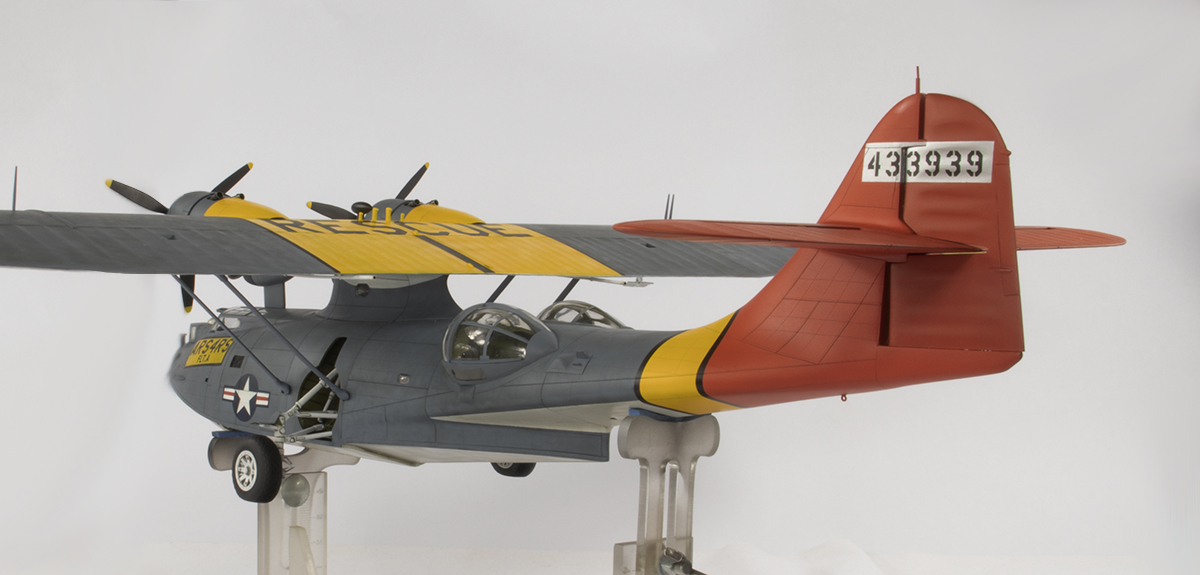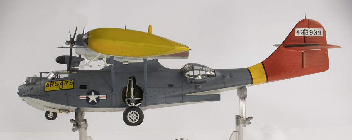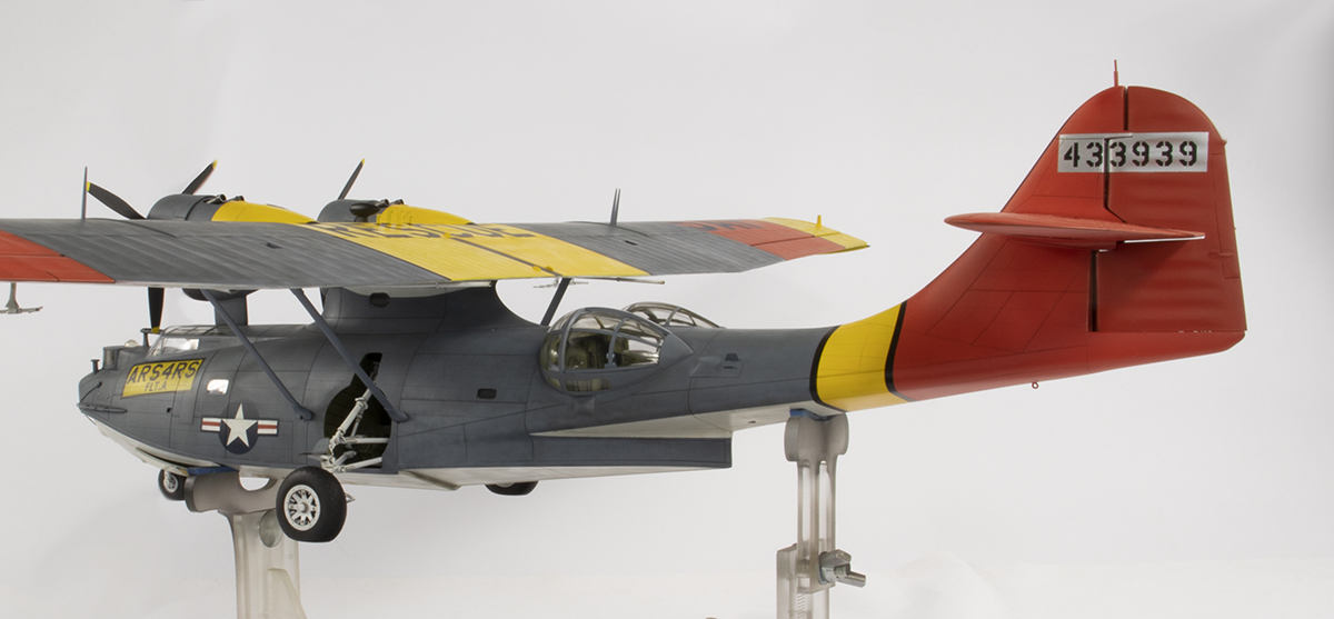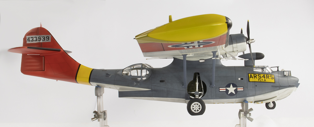 I wanted to make the brightly-coloured example that was provided by Revell and is illustrated on the box art: a blue and white USAF SA-10A with a red tail and wing tips and lots of yellow bands and panels. I don’t know if this scheme was unique to 4433939; I couldn’t find any other similarly marked Catalinas on the internet as most seem to not have had the red markings. 4433939 is not that well documented in terms of images I could find via Google, and in the end I only managed to track down lots of different versions of two photographs, both clearly taken at the same time and of the port side, one from the front and one from the rear. The best one is on Wikipedia.