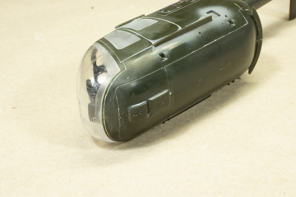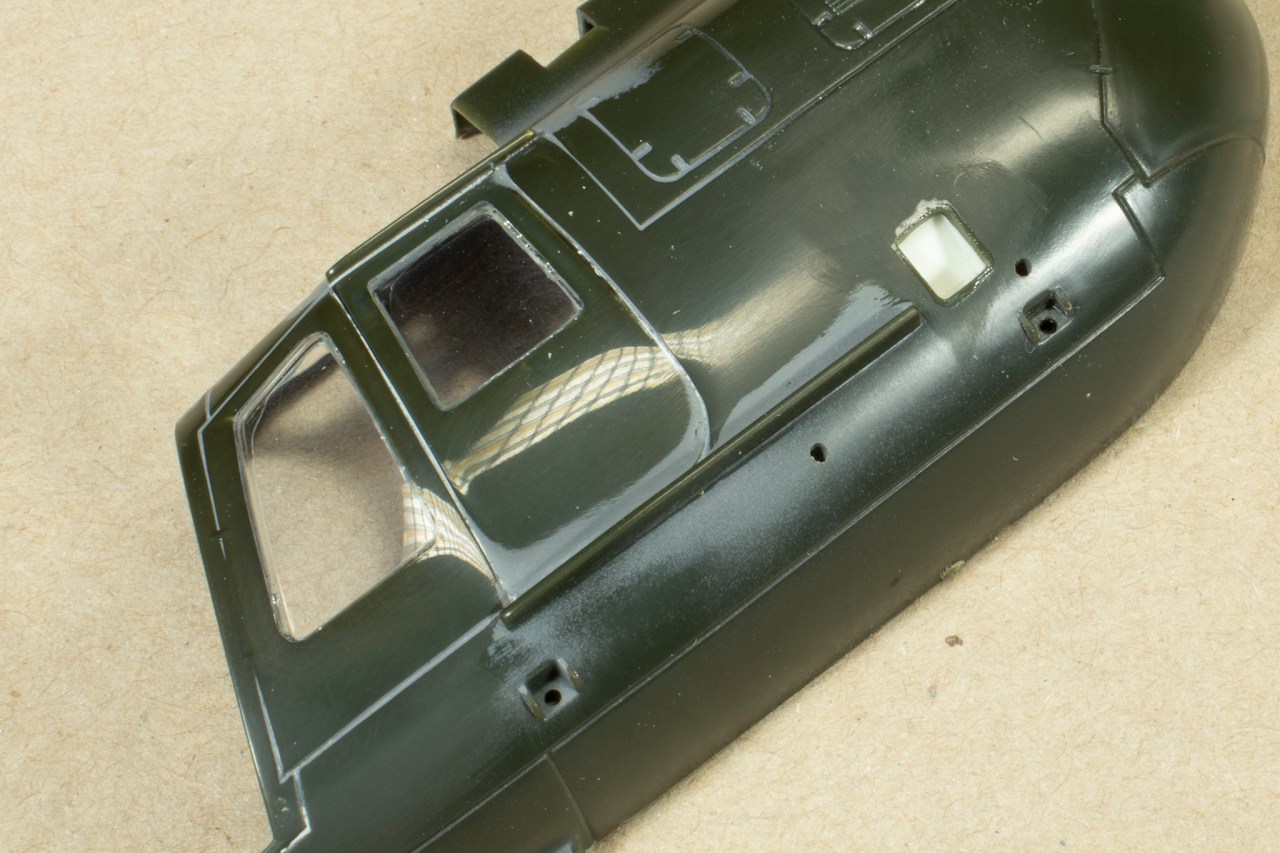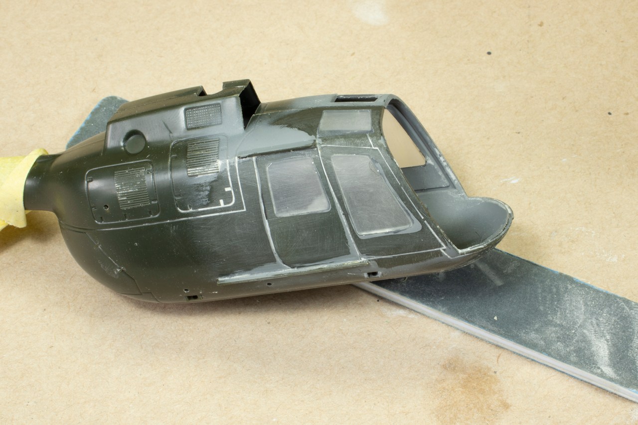 Once I had dealt with as much of the fuselage as I could, I attached the front windscreen. This is a big moment in a helicopter kit like this, and will make or break the model. Thankfully, unlike the side windows, the windscreen was a very good fit. It still needed to be filled and sanded in places, but there were no huge gaps. I set to with my various sanding tools once again to get rid of the seam, and took the opportunity to go over the cabin windows again. I did try as much as possible to retain the moulded frame detail on the windscreen.