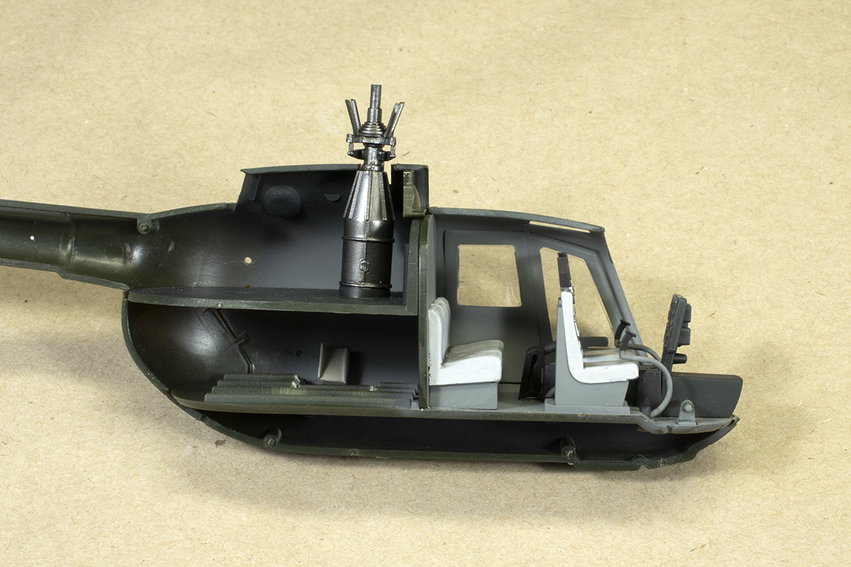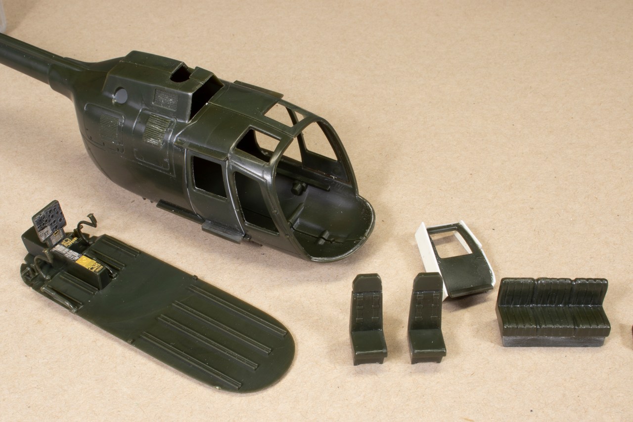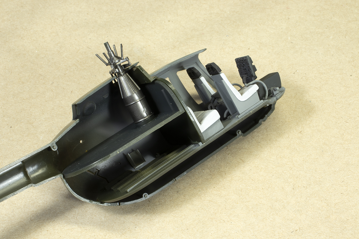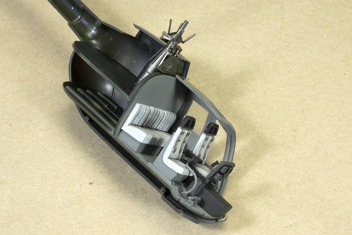 The provided interior is basic and I did little to improve it. The seats have incorrectly shaped headrests and I modified them to be more accurate. Sadly, I was not paying attention to my references, and my improvement is little better than the original as there ought to be three holes, not two. There should be two prominent fire extinguishers, one by each set of pedals, and these are highly visible in photos. Revell provide a single extinguisher of a different shape; I did not add the other. The instrument panels are all flat and I used some old Reheat generic photo-etched detail set to make the instrumentation more 3D. German Bo105s also have quite a distinctive instrument panel shroud, but again this was not provided and I did not recreate it. In short, the interior is rather inaccurate.