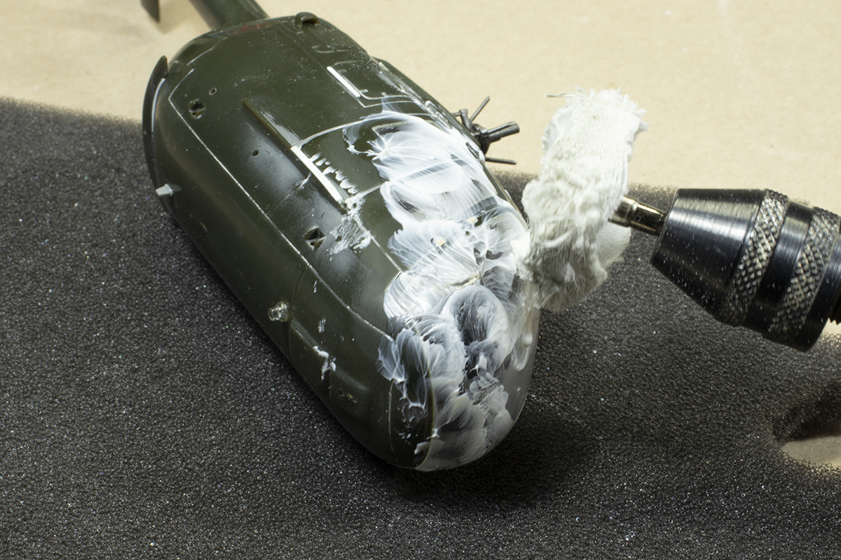 Wet sanding using Infini sanding sticks, sponges and films from 400 grit up to 2500 grit levelled everything out across the windows and doors. In some places, further filling with superglue was required as a few gaps became apparent. Once I was done, I moved to applying Tamiya polishing compounds with a cotton buffing wheel in my Proxxon motortool. This is extremely messy and I usually don a big bin bag and goggles to prevent me getting covered in polish.