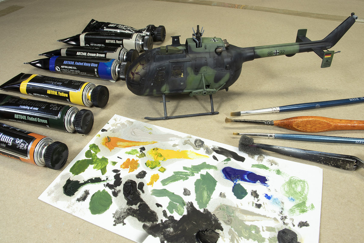 Once I had something I was happy enough with, I left the oils overnight to dry and played around with some pencils the next day, mainly Smoke, Rubber and Dark Grey. I draw onto the area I want to affect, and then use a brush dampened with water to blend in the pigment. I find this can give some very smooth transitions, and I mainly focused it around the doors, along the top of the tail boom, and on the roof.