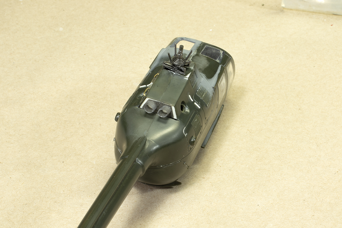 Various issues with the main airframe were dealt with next. The door outlines needed rescribing, and this was completed with a needle. The grab handles on the left side were added from brass wire (I forgot to add a third, which should be near the sliding door) and some other features from plastic card. The replacement exhausts from DF HeloStuff are moulded on a panel which is woefully undersized, and so I had to add a blanking piece from card.