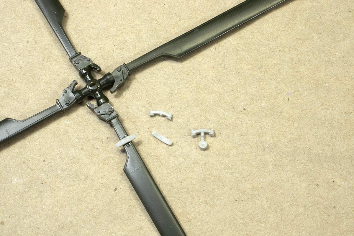 First up were the balls that hang from the rotor blades. A rummage through one of my spares boxes turned up several triplets of spheres that looked about the right size. I’ve no idea where these came from, although I suspect it was MiG of some kind. Eight of these balls were drilled to accept some plastic rod. The mounts were adapted from some sway braces (also found in the spares box). The shapes are not right, and the rod is a bit thick, but it gives a good impression of this obvious feature of the real thing.