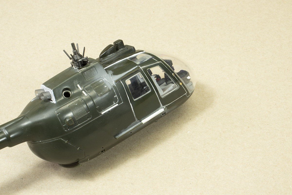 After the windscreen, the last major component was the TOW sensor over the cabin. I believe that this part, and the pylons, are later additions to the basic kit. The TOW sensor completely lacks any lens detail at the front, which is a shame, and does not fit wonderfully well. I applied plenty of coats of Mr Surfacer 500 to build the transition up between the sensor base and the roof. Once dry, it was all carefully sanded down. This was also when the door sills were rebuilt from plastic card and the front door hinges (which has been collateral damage in sorting out the windows) replaced with some scrap photo-etch pieces.