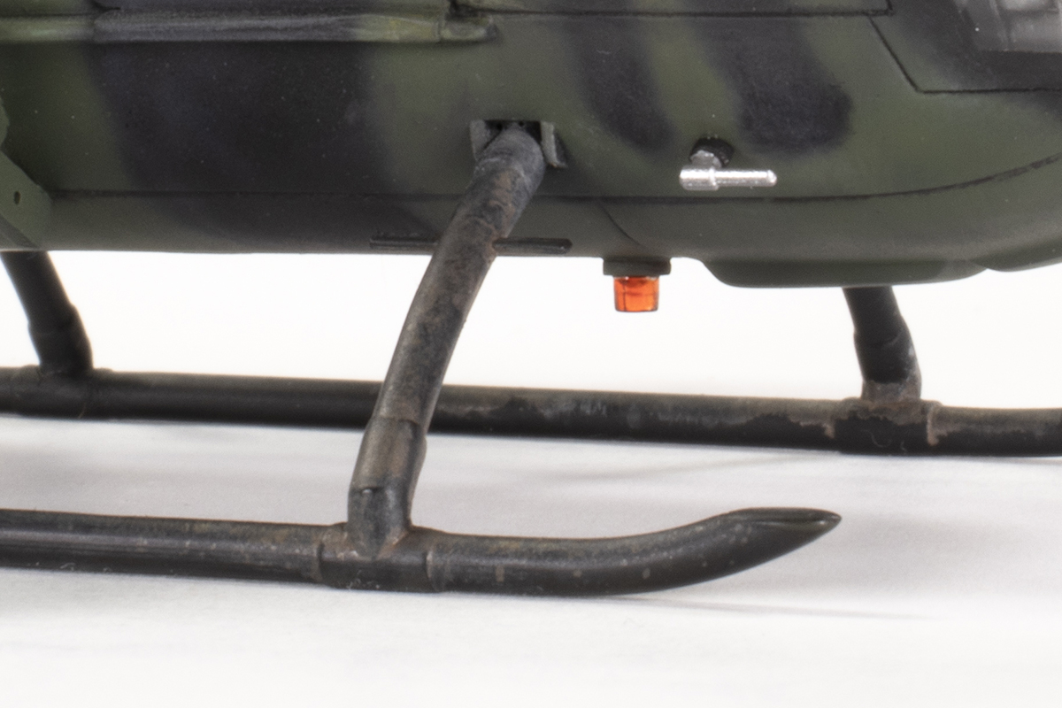 The kit best represents an early PAH-1 without the FOD guard over the engine intake area. Later PAH-1s also acquired some sort of sensor on each side of the fuselage above the pilots and a baffle below the grille on the starboard side of the rotor housing. The upgraded PAH-1A1 variant had the staggered TOW tubes rather than the flat configuration in the kit. Also missing from the kit are the distinctive ‘balls’ that hang from each rotor blade, although some very old photos don’t show these, so perhaps they were also a slightly later addition. Careful comparison of the kit fuselage with photos shows the recessed fuselage detail is mostly wrong (it seems accurate for the civil version) and that Revell omitted various hand holds and lumps and bumps around the airframe, as well as the housing for the red light on top of the tail. This light, and the one provided for underneath the fuselage, are far, far too small as moulded. The panelling under the nose is completely the wrong shape and does not feature the retractable light; the markings schematic in the instructions shows what this should look like. Lastly, the fuel filling point is wrong for this version and should be recessed into the fuselage.
