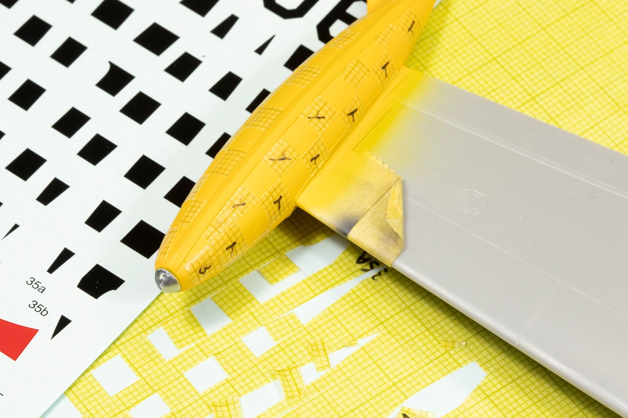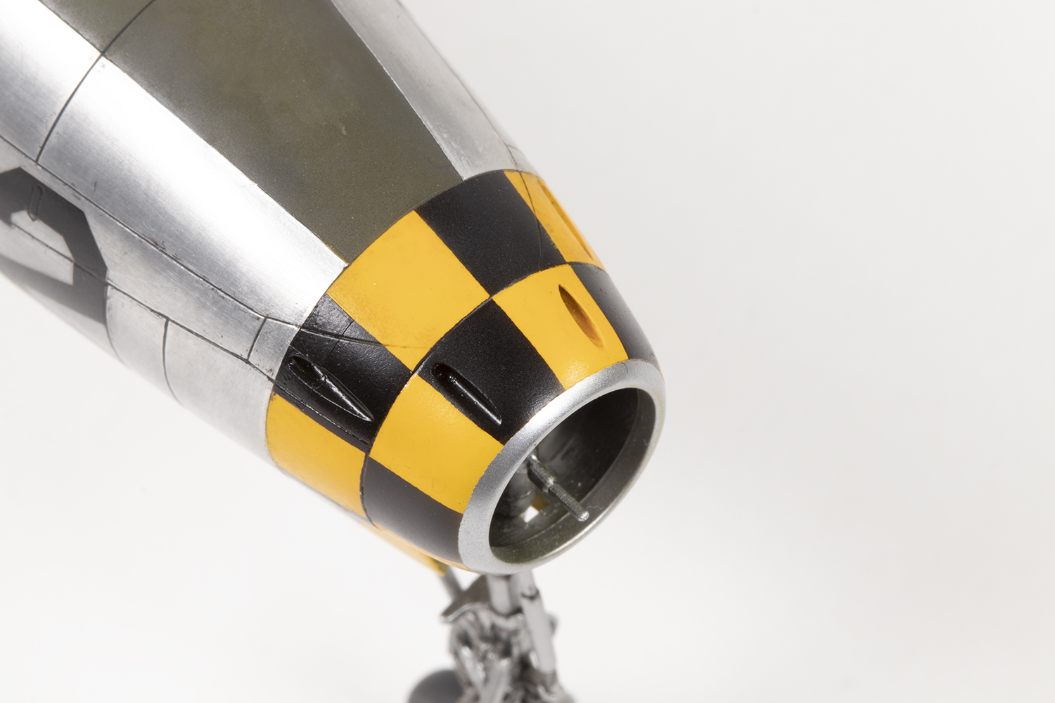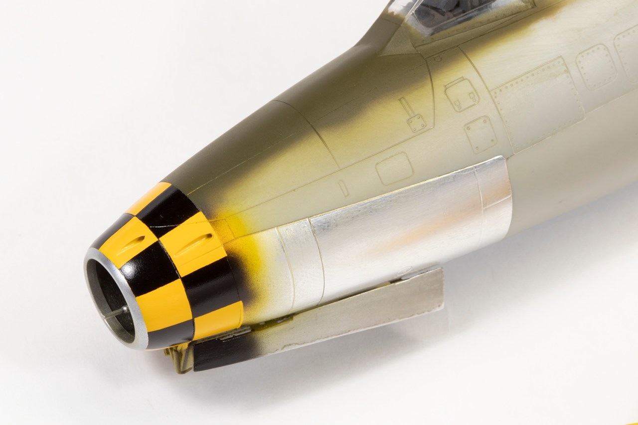 With the lines now scribed in I could turn my attention to the paint. The chequered nose looked the hardest, so I decided to start there. I always like to start with the hardest areas first – if I can’t get it to work, then I needn’t bother continuing! The yellow is MRP-122 RAF Marking Yellow, which was a wonderful match for the colour on the decal sheet. The black chequers were cut from Tamiya masking sheet using a Silhouette cutter with a design traced from the decals. I prefer Tamiya masking material for this kind of location because the curves require a fairly thin and sticky mask. The black was simply Tamiya X-18 Semi-Gloss Black. I was happy enough with the result, although the natural metal lip at the front was not as even as I would have liked. I also experimented with airbrushing the foil on the nose gear doors with Mr Metal Primer before spraying the yellow and black in this area. The idea was that the primer would improve paint adhesion. This turned out to be a mistake as the primer remained sticky for days and was very fragile when subjected to white spirit or alcohol. In the end I just wiped it off with these products.