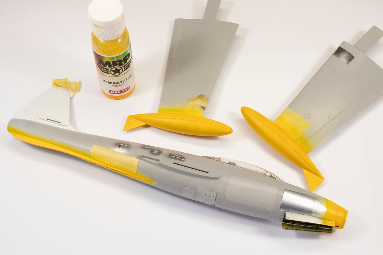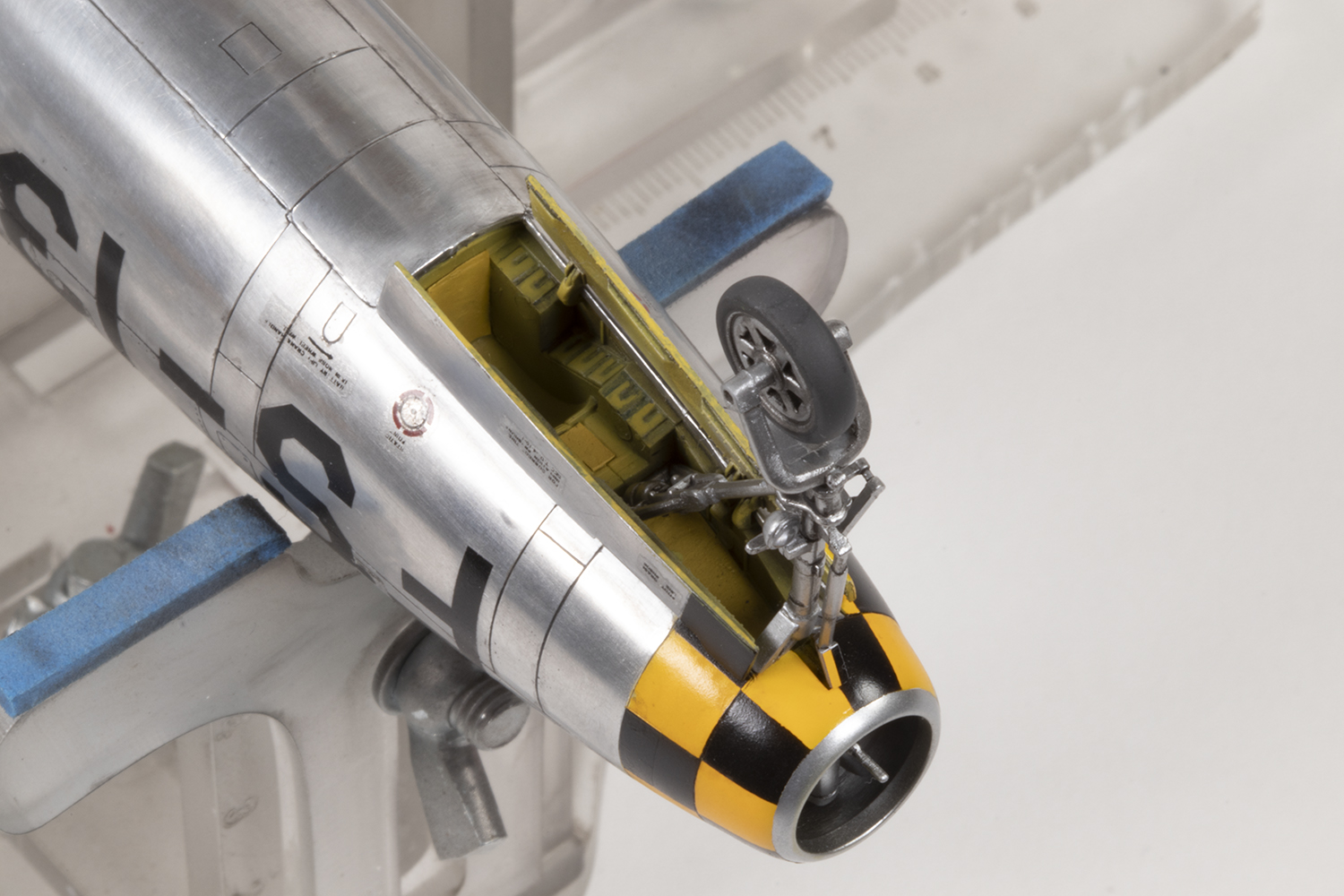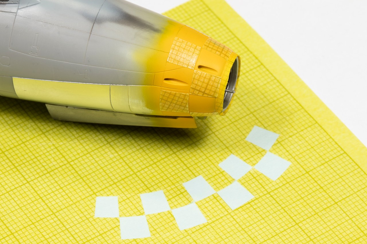 With the lines now scribed in I could turn my attention to the paint. The chequered nose looked the hardest, so I decided to start there. I always like to start with the hardest areas first – if I can’t get it to work, then I needn’t bother continuing! The yellow is MRP-122 RAF Marking Yellow, which was a wonderful match for the colour on the decal sheet. The black chequers were cut from Tamiya masking sheet using a Silhouette cutter with a design traced from the decals. I prefer Tamiya masking material for this kind of location because the curves require a fairly thin and sticky mask. The black was simply Tamiya X-18 Semi-Gloss Black. I was happy enough with the result, although the natural metal lip at the front was not as even as I would have liked. I also experimented with airbrushing the foil on the nose gear doors with Mr Metal Primer before spraying the yellow and black in this area. The idea was that the primer would improve paint adhesion. This turned out to be a mistake as the primer remained sticky for days and was very fragile when subjected to white spirit or alcohol. In the end I just wiped it off with these products.