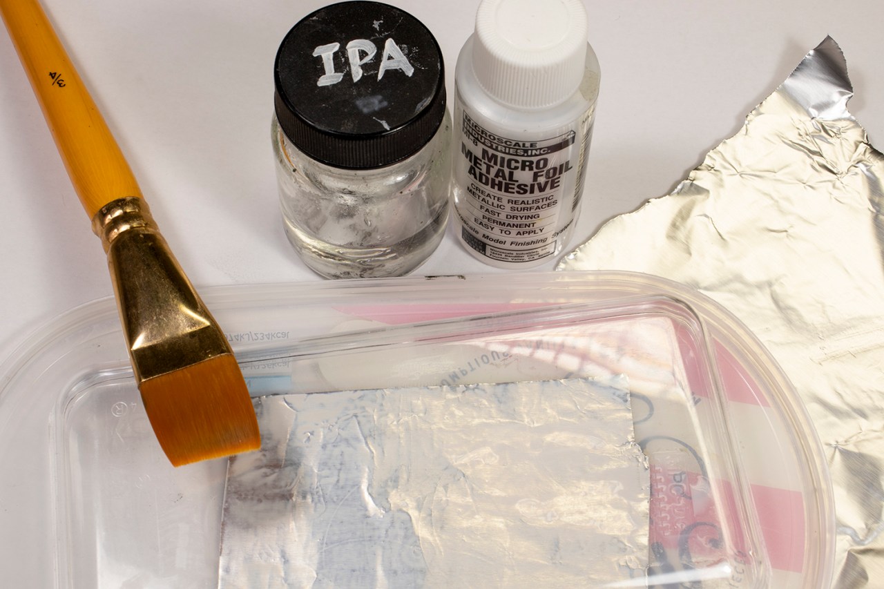 My chosen method for applying the glue was with a wide brush. First, I cleaned the foil with 100% isopropyl alcohol (IPA) and then dripped some glue on the shiny side. I spread this around with the brush, and then dripped on more IPA and cleaned off the glue with the brush. I then reapplied the glue in the same way. Sounds weird, but this helps stop fisheyes appearing in the glue and gives a more even coverage. What I found out later on is that it’s much better if the foil is completely smooth before you do this – any creases or dips and the glue will pool in it and give an uneven surface. Once the glue is applied the foil should be left until it goes clear; I leave it under a cover to stop bits of dust dropping in it.
