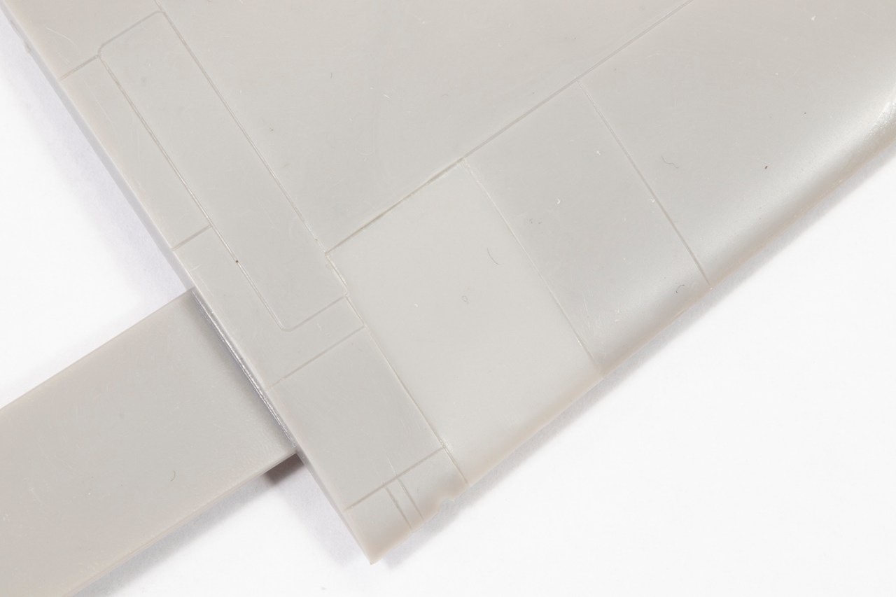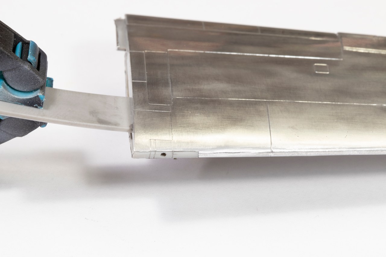 This then leaves a very sticky piece of foil. The plastic also needs to be cleaned with IPA and be free of dust and fibres. I place it where I want it to be and burnish it with my finger or a cotton bud, followed by the sharpened dowel to outline all the recessed detail. The excess foil is cut off using a sharp blade run along panel lines. In some areas, like the front of the wing roots, creases are inevitable. This is where the beauty of the heavier gauge foil comes in, as these can (very carefully!) be sanded out.
