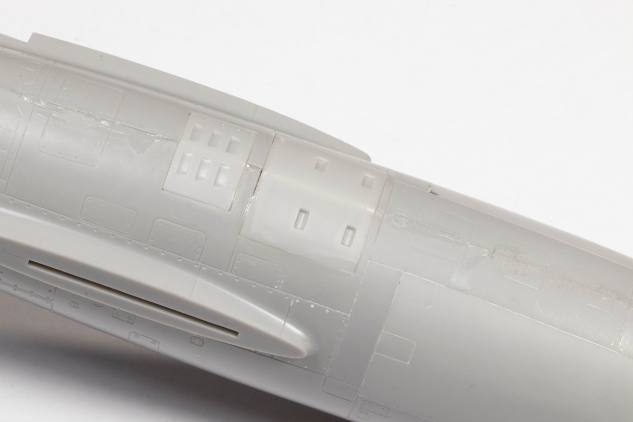 Like Tamiya, Revell split the nose gear bay in two along its length. I guess that’s the simplest way to mould it, which is a shame as there’s an enormous seam to deal with. I made a half-hearted attempt to cover it with some superglue-soaked paper, but it doesn’t look very good. I’m never that interested in dealing with stuff that will be almost invisible on the finished model.