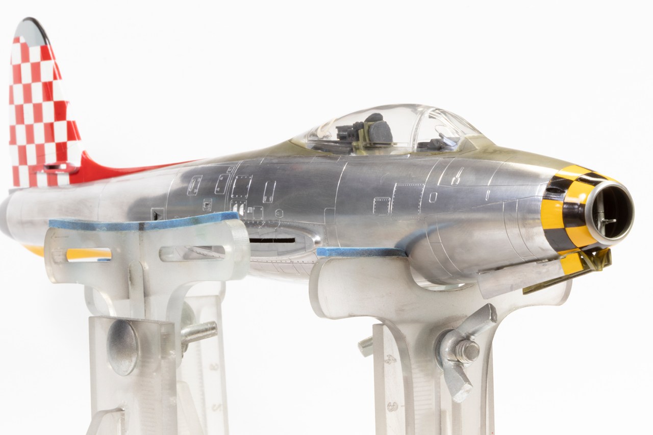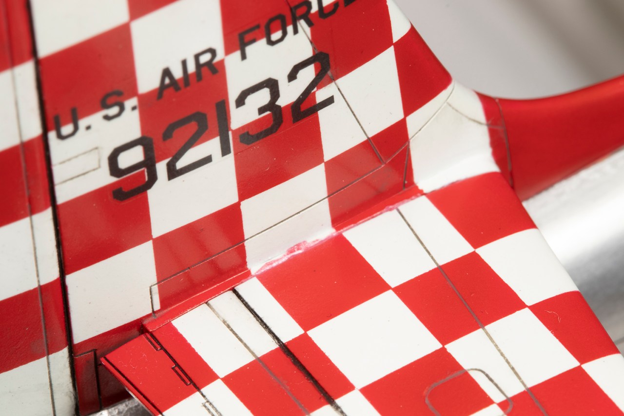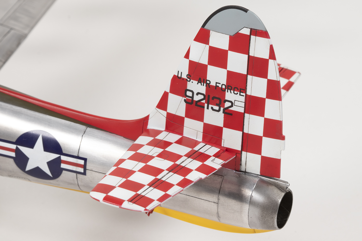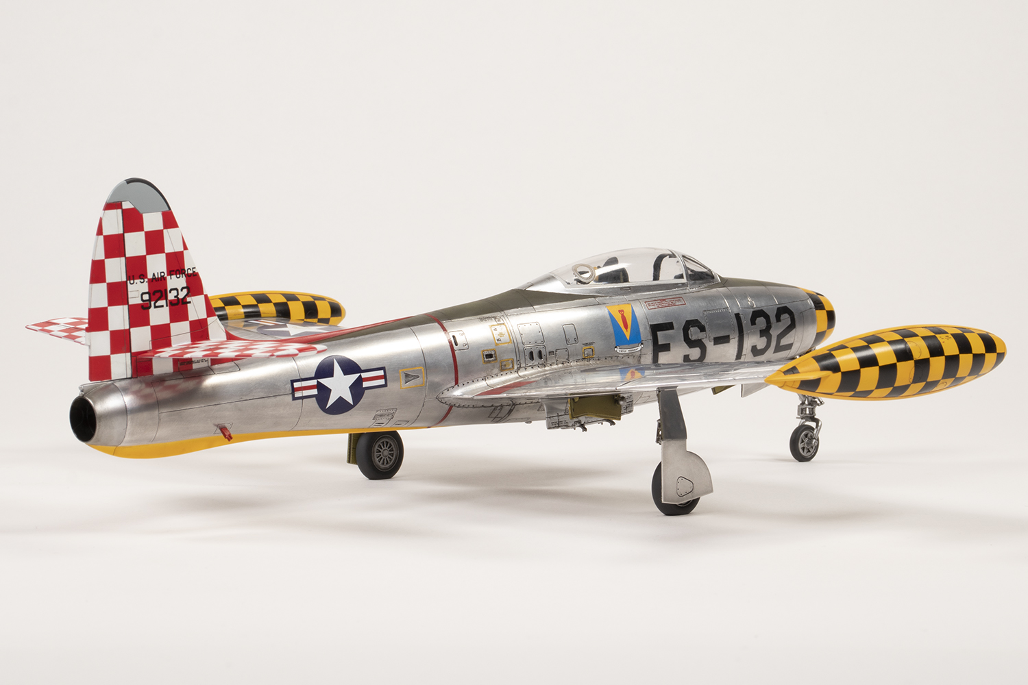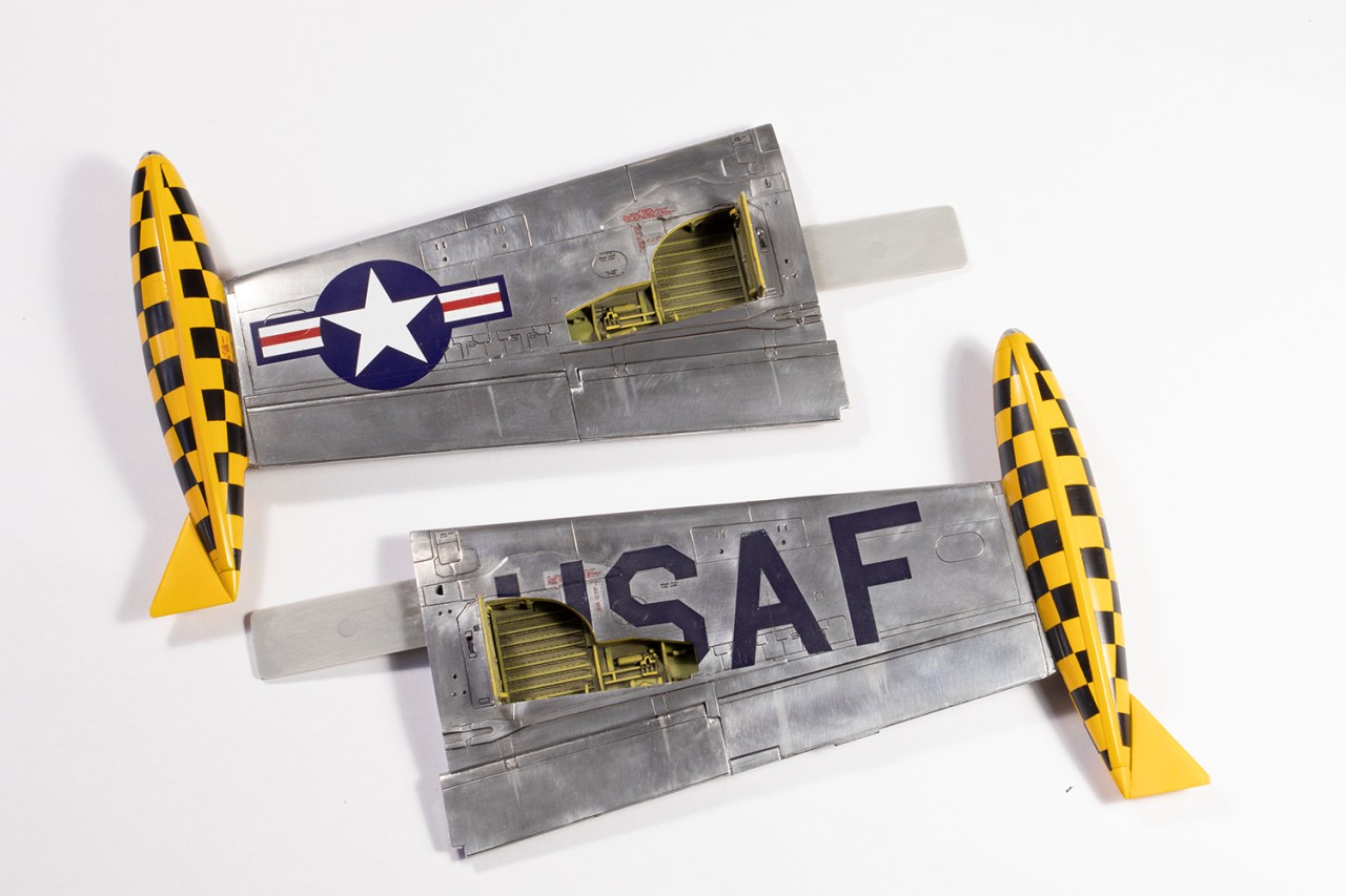 Whilst on the tip tanks, it’s worth mentioning the lights at the front. These can be improved by painting a blue/red bulb in the lower half and then painting the inner half in aluminium as per photos of real F-84s. I tried for many hours to locate a photo of FS-132 online and failed to do so, which means I’m trusting Aeromaster’s research and filling in a few gaps from photos of similar airframes.
