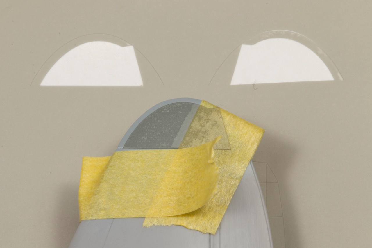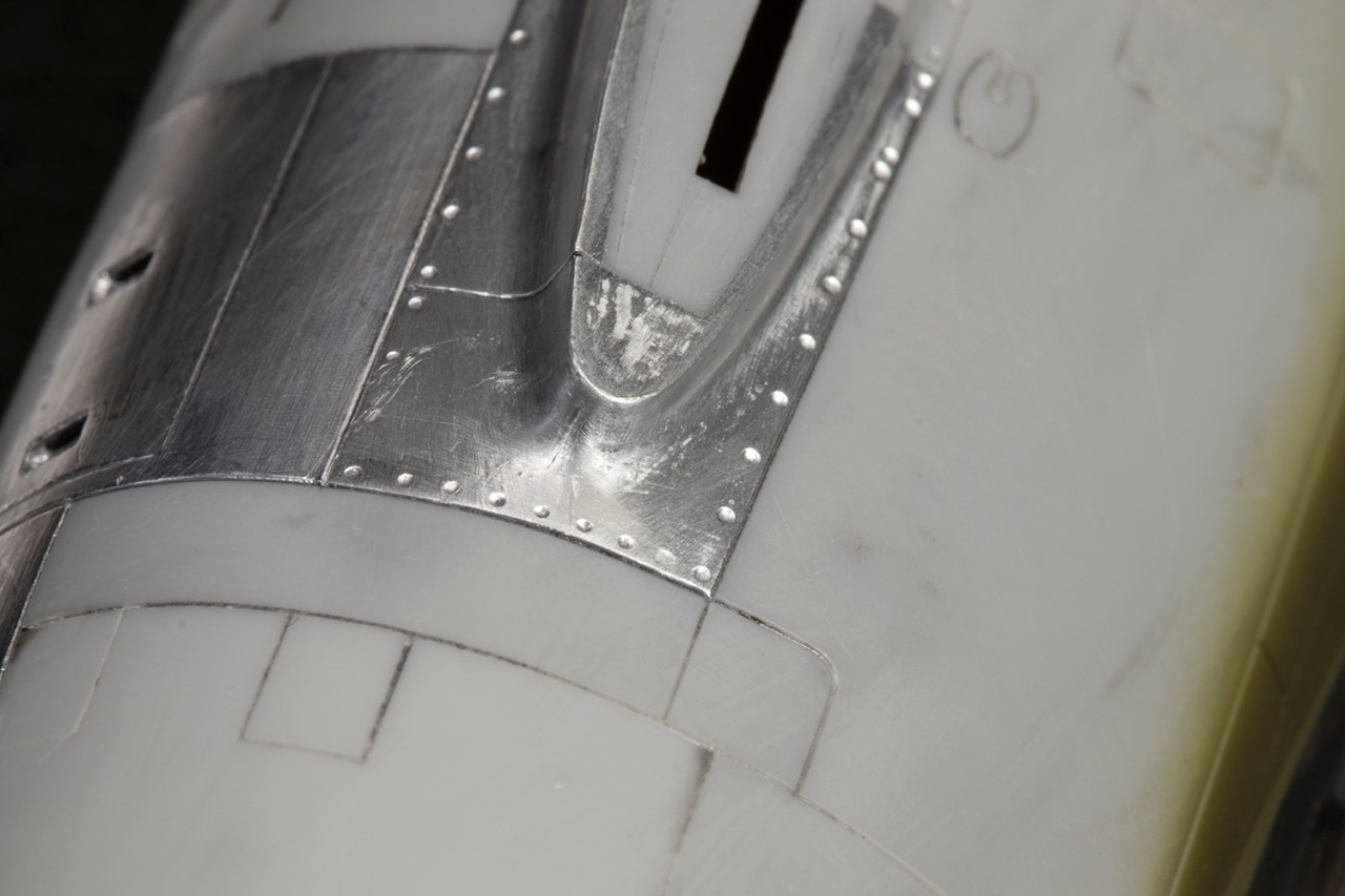 I decided to create false panel lines where the foil and paint meet. The idea was that these lines would then make trimming the foil against the painted areas easier by acting as a guide for the scalpel blade, and this worked fairly well. I scanned the Aeromaster decal sheet and created a stencil for the chequered area of the nose which then became a guide for the demarcation with the aluminium to be scribed in. The very lip of the nose was also meant to be natural metal and I elected to paint this as the radius of the curve would make foiling impossible (for me at least). A similar fake ‘panel’ line was scribed in along the upper fuselage to demarcate the olive drab anti-glare panel.