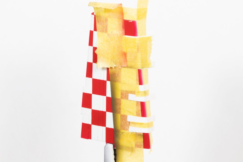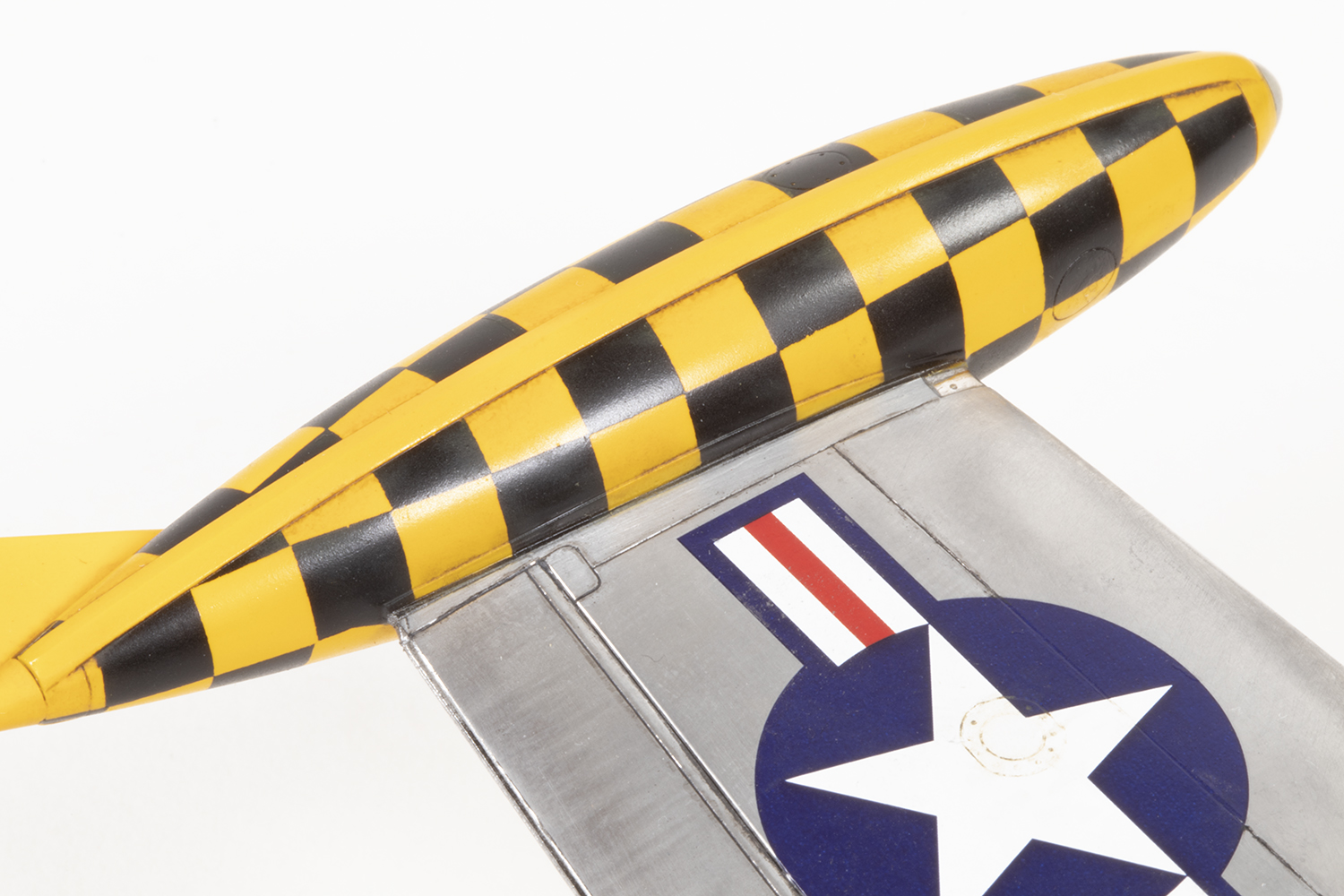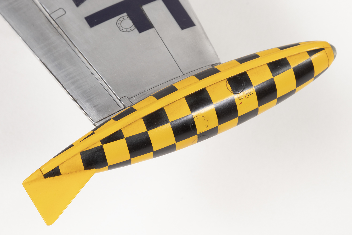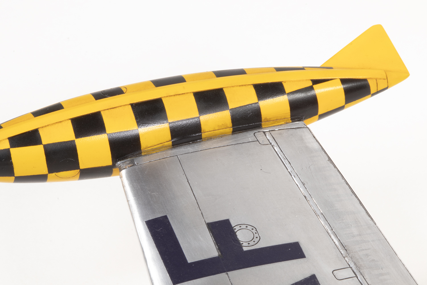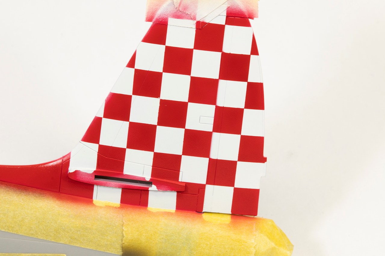 As with the black and yellow pattern, I knew there would be plenty of touch ups required, especially where the vinyl masks didn’t conform very well at the rudder hinge. However, rather than use decals to fix the problems, I went back and forth with the masks and paint in an iterative process until it looked good enough. I dealt with the leading edges separately and whilst the chequers don’t match up perfectly, I felt it was adequate. This was my first attempt at masking chequers and I’d happily try it again.