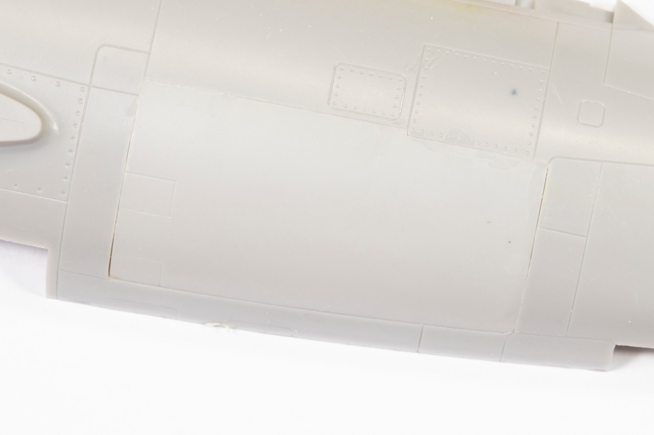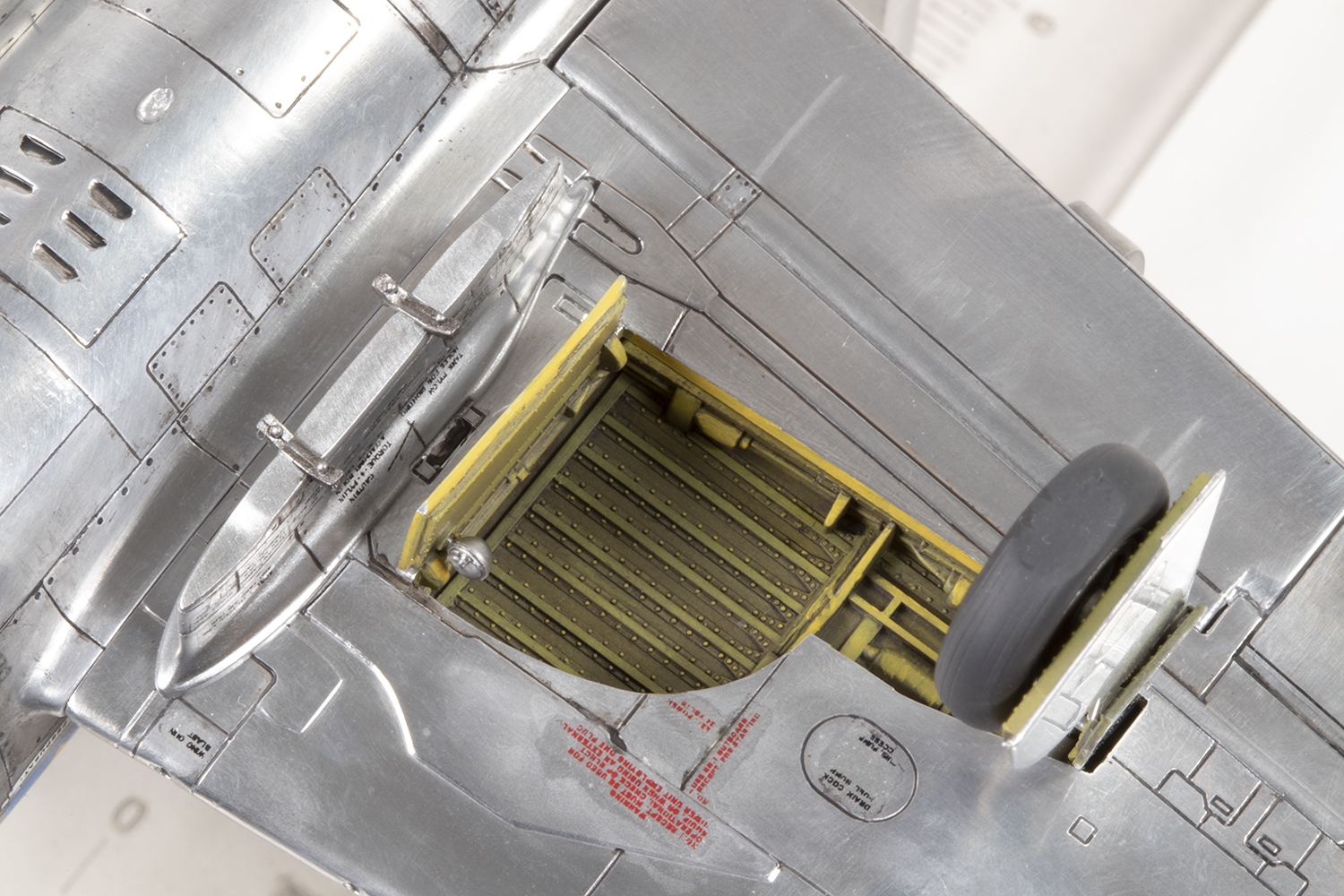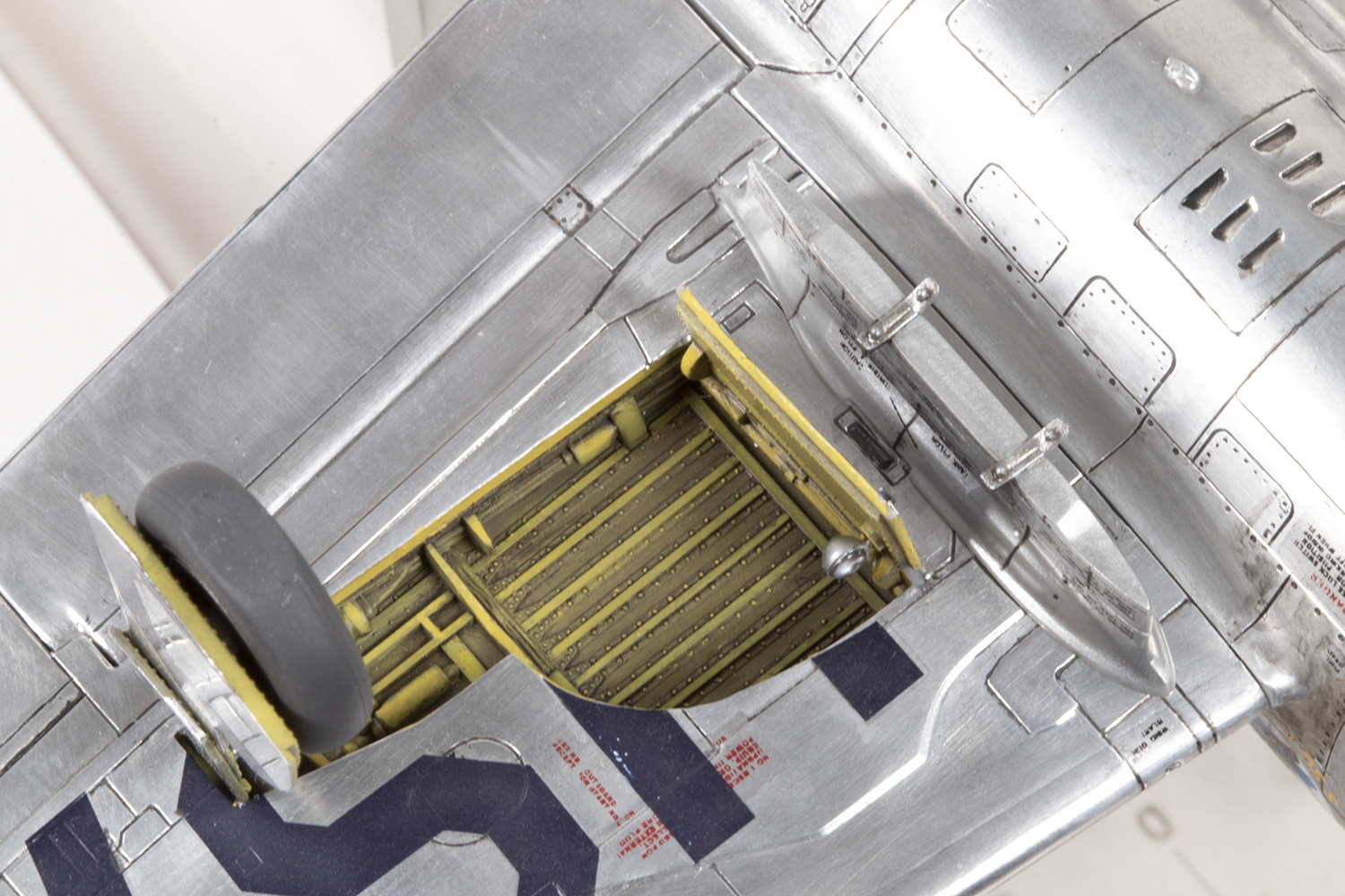 There are some odd engineering decisions, mainly the undercarriage doors which are integrally moulded with the gear bay walls. They therefore need to be installed early and generally get in the way. This was a fad of the time (see also Revell’s 1/48 P-47N and Tamiya’s A-1 Skyraider) that thankfully has not caught on although it still crops up from time to time; it’s a real pain. On the upside, the moulded detail for the cockpit and undercarriage was excellent for the era and more than adequate for my purposes – a more detailed turtle deck (the area under the canopy behind the seat) would have been the only upgrade I would have made if I could. The seat is a late type (and it’s possibly inaccurate for my subject) and I added some seat belts made from masking tape and photo-etched buckles from Anyz and Reheat