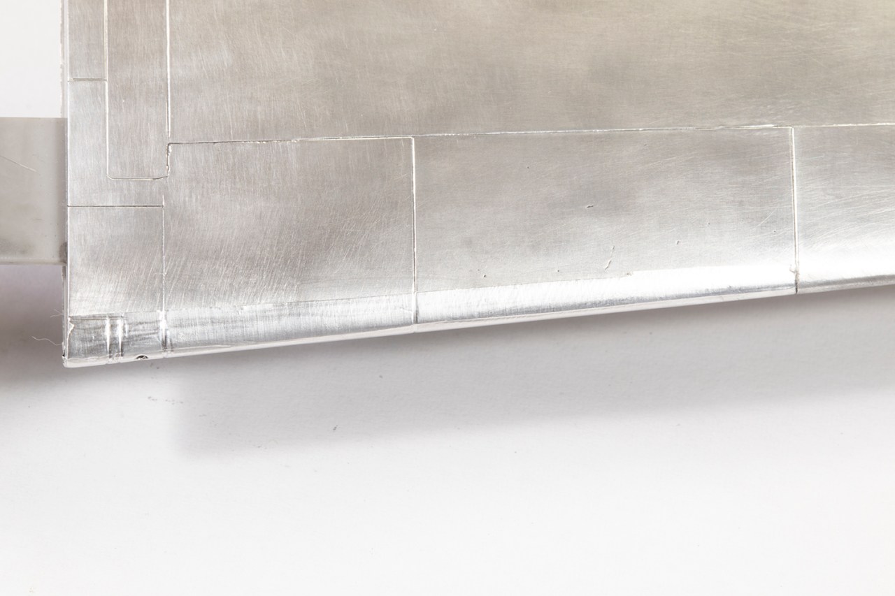 This should result in a smooth, brushed aluminium surface. I could never get it completely smooth, I think because the foil and underlying glue layer are soft. The final step was to polish with Tamiya Coarse polishing compound using a polishing wheel chucked in a Proxxon motortool. Of course, you could also progress through the Fine and Finish compounds, too, but I felt the Coarse grade was enough.