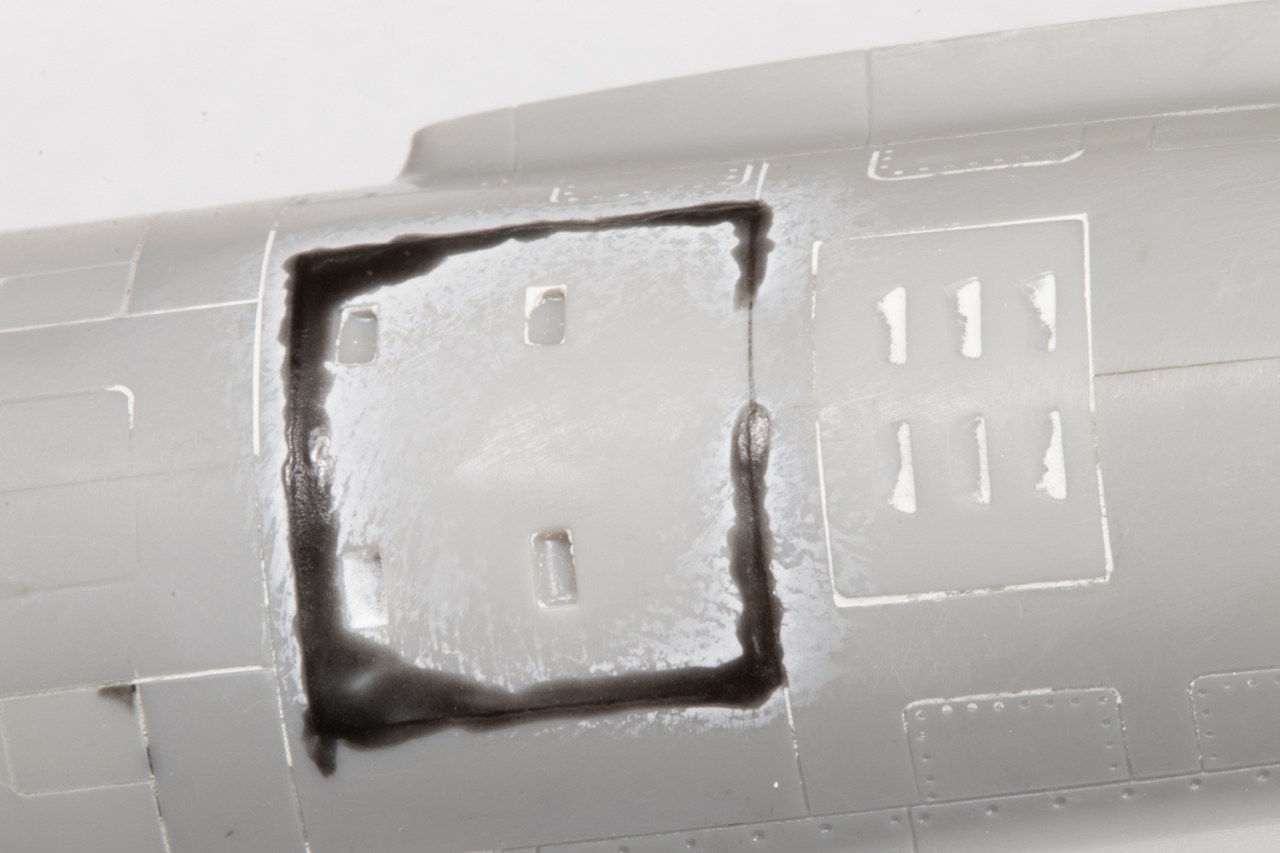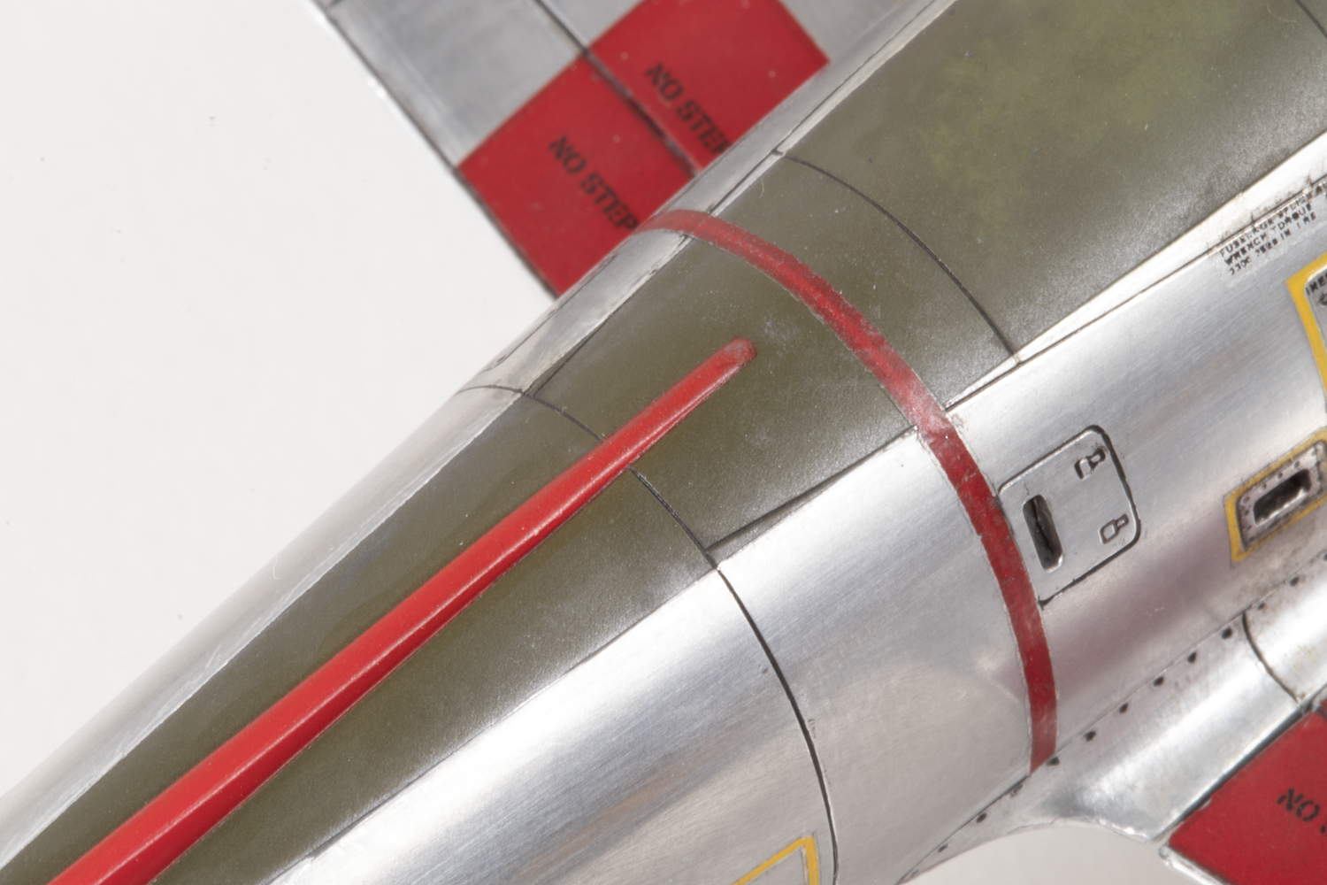 I also knew that weathering was going to be a challenge. A panel line wash of some kind would be essential to avoid the panel lines glinting in reflected light. I tried an ink wash as it dried quick and hard, but getting it consistent was very difficult. I wanted some dirt build up around the wing roots and fuselage hatches, but in the photos the latter looks too messy. One thing I realised when working with such a shiny metallic surface is that it’s really hard to see what’s going on. The reflections drove my brain crazy and the appearance can change quite dramatically depending on the light and the angle it hits the surface.
