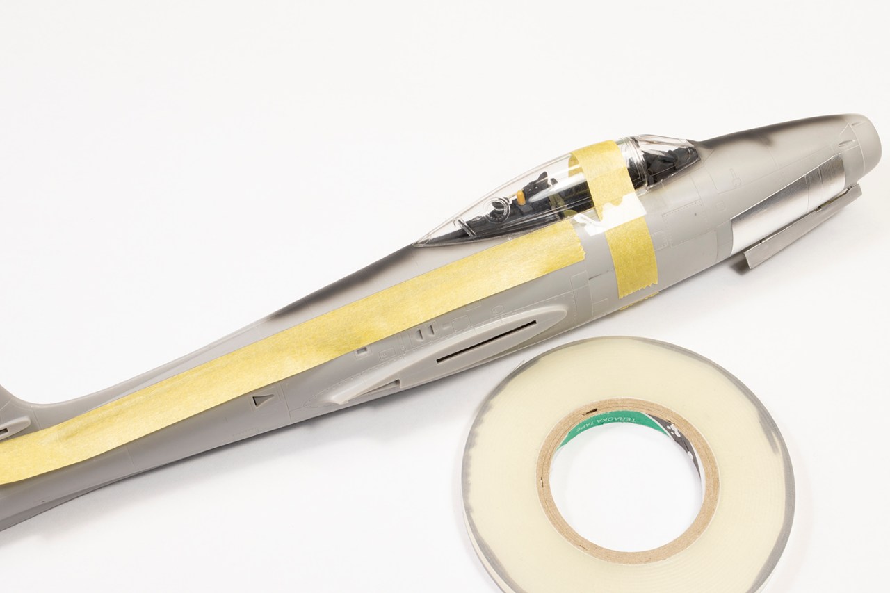 With that done I could crack on with construction. The fit of the wings and tailplanes to the fuselage is so good I decided to add them right at the end. This would make masking the chequers and adding the foil much easier. The overall fit is very good and the main parts were all glued together with superglue and the seams filled with the same. To improve the fit of the clear parts some Tamiya tape was used to narrow the fuselage just a little bit before they were stuck on with Tamiya Extra Thin. I installed all the separate control surfaces in the neutral position and the airbrake closed as per most photos of parked up Thunderjets.