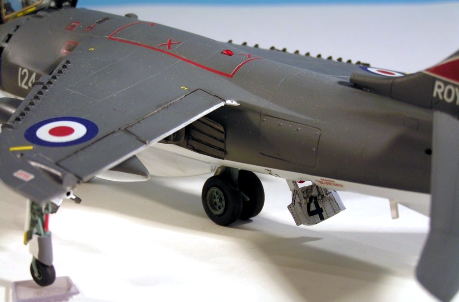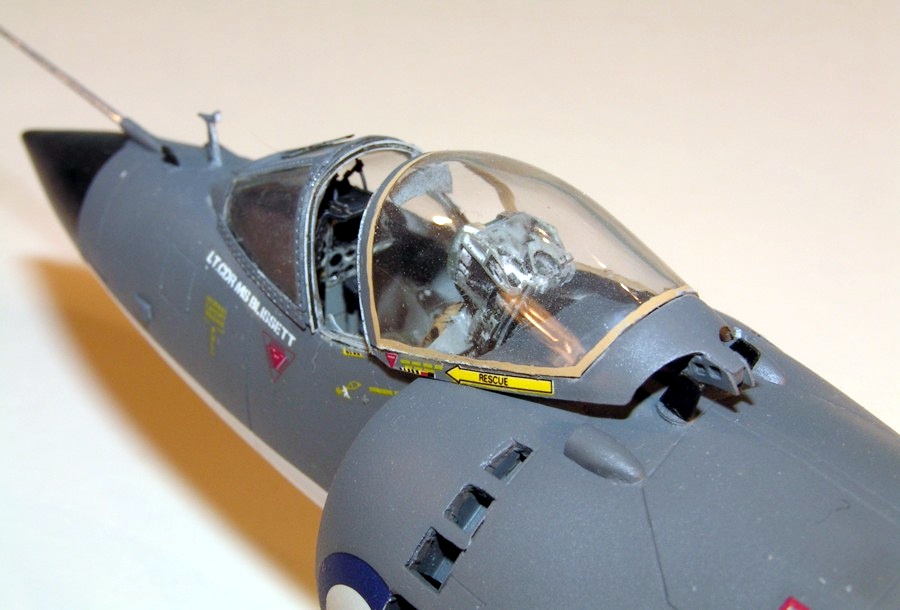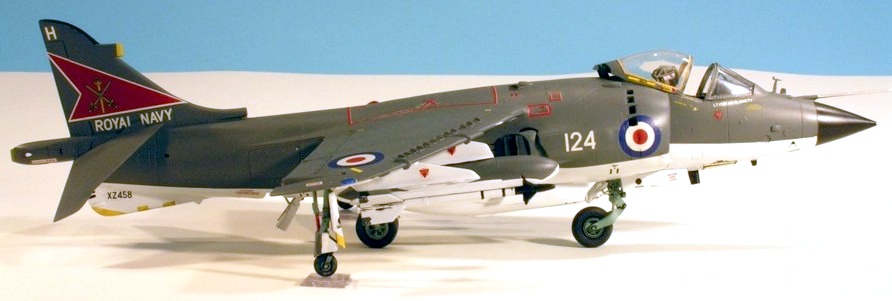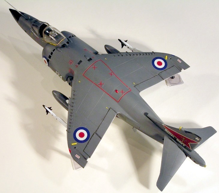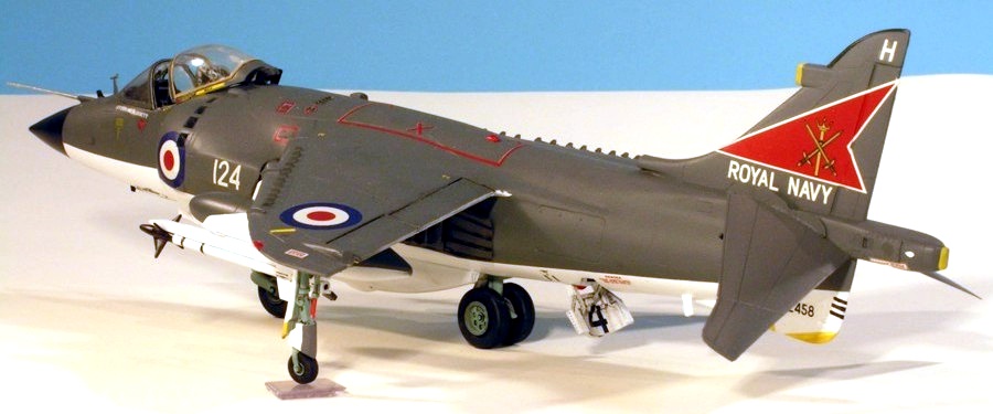 This is an example of a kit which I tried to improve by adding aftermarket parts, but thought that would be enough and so neglected the finish. This was a mistake! It doesn’t matter what you add, the basic construction and finish need to be up to scratch to produce a nice looking model. Tamiya’s Sea Harrier FRS.1 is not a good kit, but I was inspired by Bill Clarke’s article in Scale Aviation Modeller International to add the Flightpath resin and photo-etch upgrade set to this kit. The upgrade set was very expensive and I was ambivalent about Flightpath generally. The set was missing parts, which were provided after a phone call (although they seemed unhappy to have to do so), and the white metal Sidewinder bodies were unusable due to poor moulding. The photo-etch was, however, extremely nice and does add a lot to the kit. It includes a huge amount of stuff and I didn’t use all of it: Canopy and cockpit details (although no seat, so I used a Paragon resin item); access ladder (not used); intake doors; FOD covers (not used); exhaust vanes; undercarriage details; four complete Sidewinders (I used Hasegawa’s instead); new airbrake (the kit item is too big); ventral strakes (I used the kit gun pods instead); lots of antennae; lots of airframe details (including wing vortex generators); CBLS.100 pod and bombs (not used); 1000lb bomb (not used); and RBF tags (not used). Overall, it is a necessary addition to the kit to make it acceptably accurate, although I believe the intakes of Tamiya’s Sea Harrier are mis-shapen, and I didn’t bother to correct that. Having gone to all the effort to add this stuff I dropped the ball on basic construction and finish. I made a half-hearted attempt to rescribe the raised lines of the original kit. I neglected to check the wing-fuselage angle and as a consequence the outrigger wheels don’t touch the ground (a common mistake on Harrier models, and one I won’t repeat with my Hasegawa Harriers!). The finish is Halfords White Primer for the undersides and Humbrol enamel for the upper surfaces. The decals from the kit were used and were okay. The model was coated with Klear and Humbrol Matt Cote.
