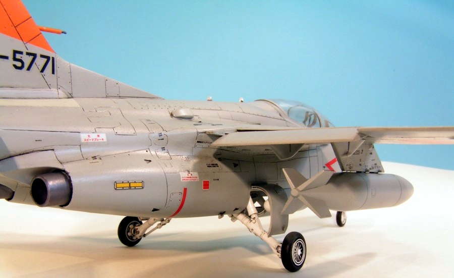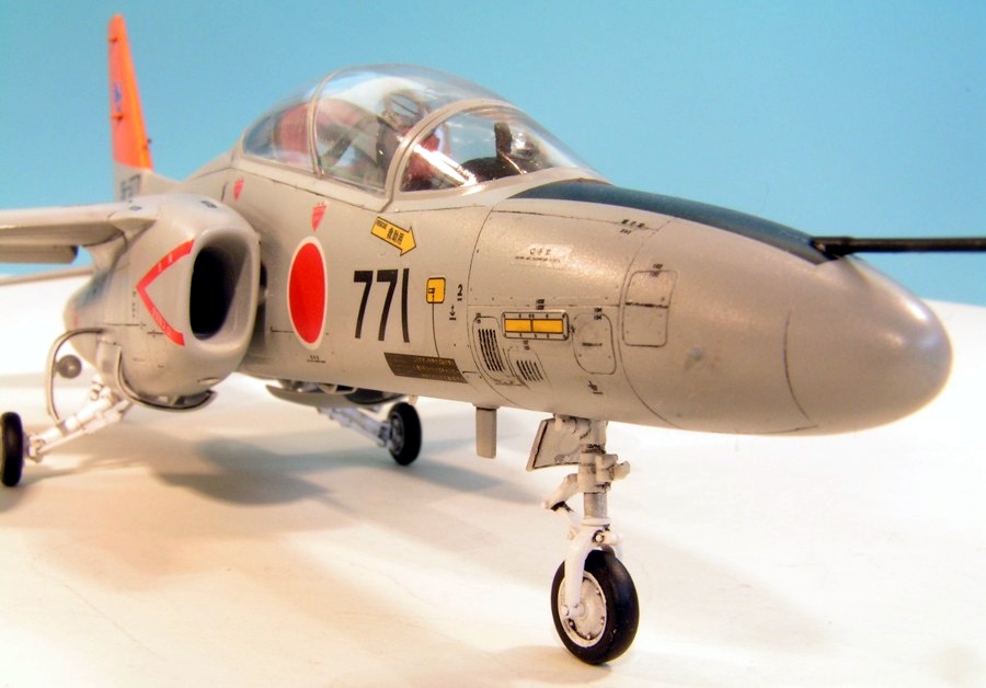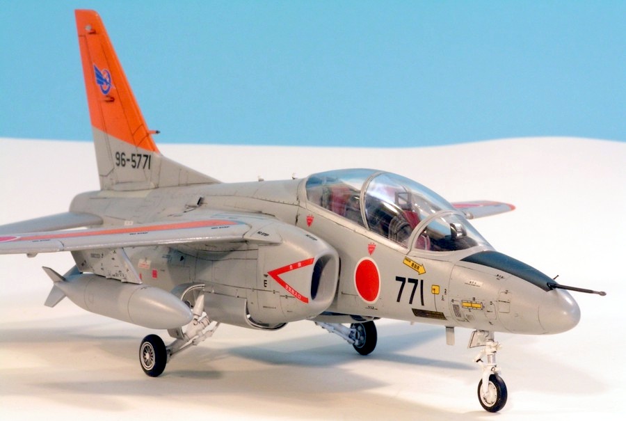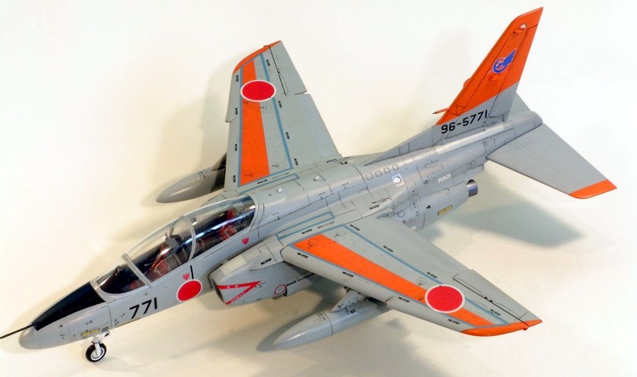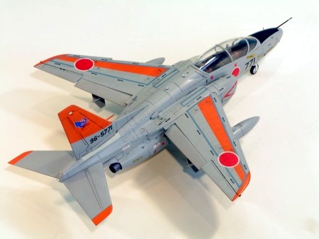 Hasegawa released their kit of the Kawasaki T-4 in the UK in 2000. As it’s a Japanese aircraft they seem to put a special effort into it. It goes together well, but not flawlessly; there is some filling and sanding to be done, but it’s minor. The kit is pretty comprehensive with complete intake trunking and poly caps to hold in the tailerons and the undercarriage. The moulding for the pitot on the nose is exceptionally fine. A very comprehensive decal sheet is supplied that enables aircraft from at least 25 different Japanese operators to be built — I chose the most colourful example with the larger-than-normal orange tail and wing sections. The only disappointment I had with this kit is that the recessed detail fades quite badly towards the edge of the major components, such as the fuselage. I built it straight from the box, apart from replacing the fin pitot with brass tube and wire, and finished it with Humbrol enamels, Johnson’s Klear, an oil wash and Humbrol Matt Cote.