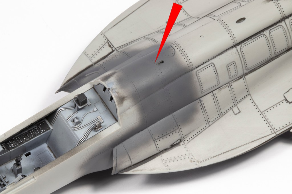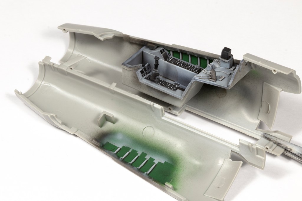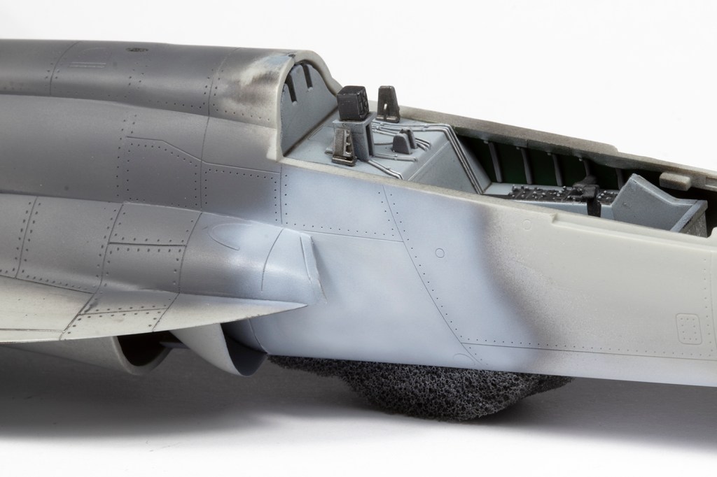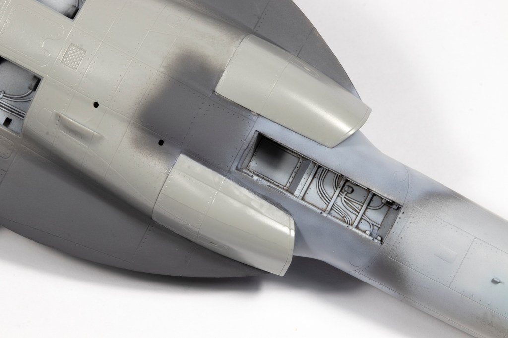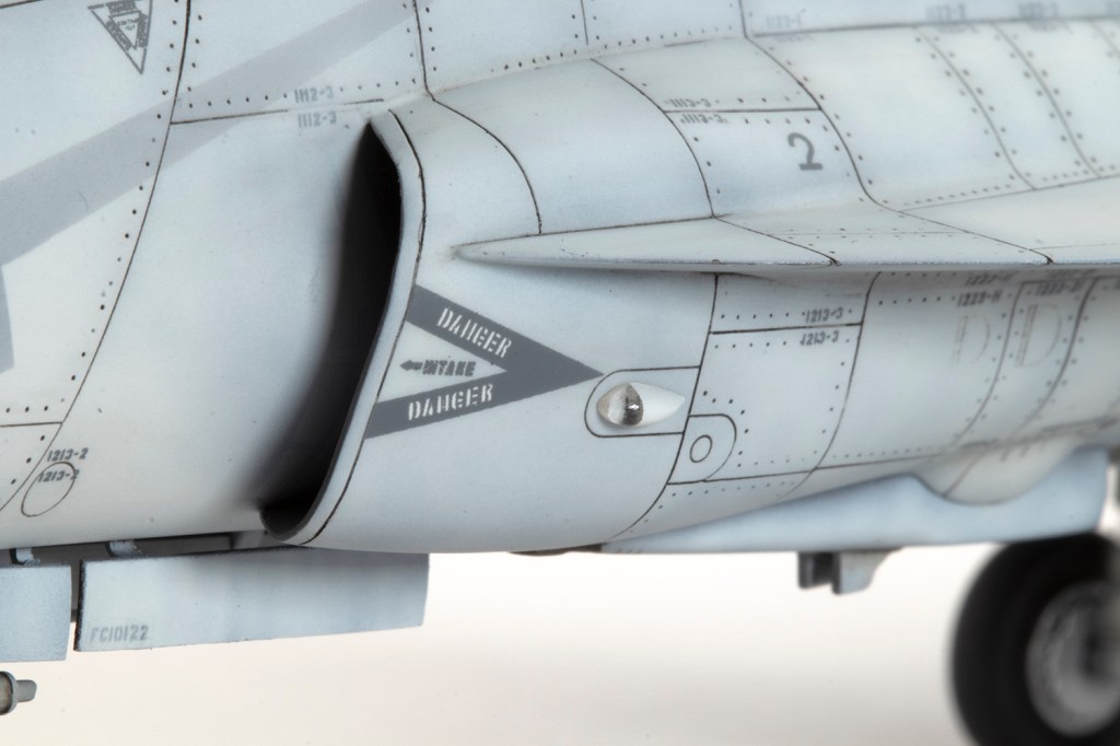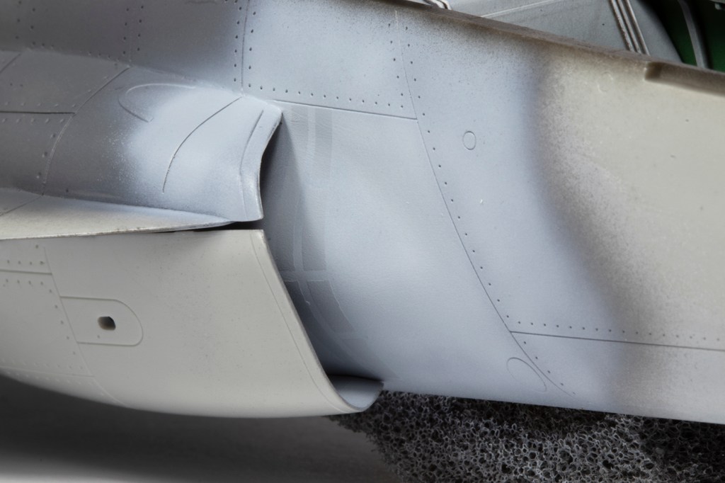 The intakes are not full length, but thanks to their unusual geometry, where the outer sides are swept forward, it’s very difficult to see up them and you can’t tell there’s no engine face. I did spend some time removing ejector pin marks from their inner surfaces, but it’s wasted effort really as you could never have seen them.