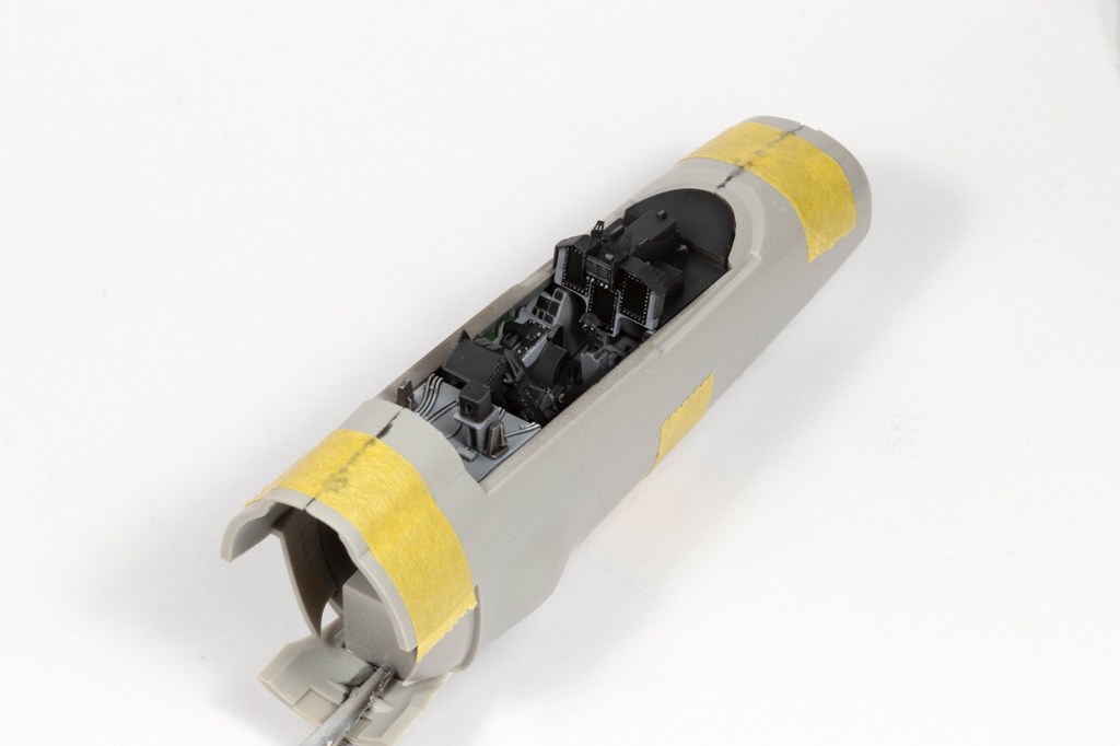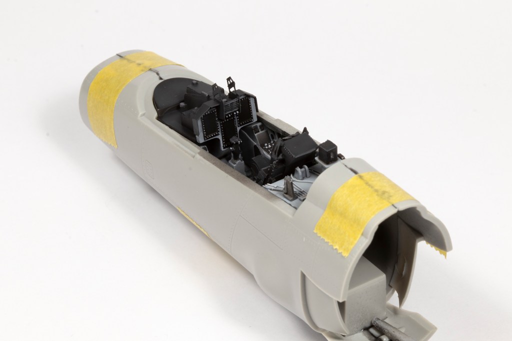 Joining the front and rear fuselage sections was uneventful and the fit pretty good. Ditto for the nose cone. In both cases, I tended to remove the seam completely with super glue and then rescribe the join afresh as they fall on panel lines. I just prefer this method as I find it easier to get a clean panel line with a 0.15mm Madworks DLC scriber and some scribing guide tape. It’s worth noting that the strips moulded into the nose are in the wrong place. I sanded them down and replaced them with some fine decal strip at the end in the correct place.