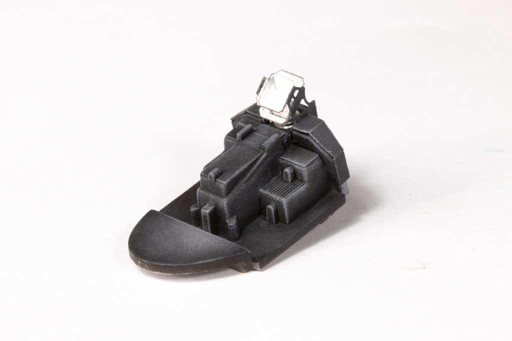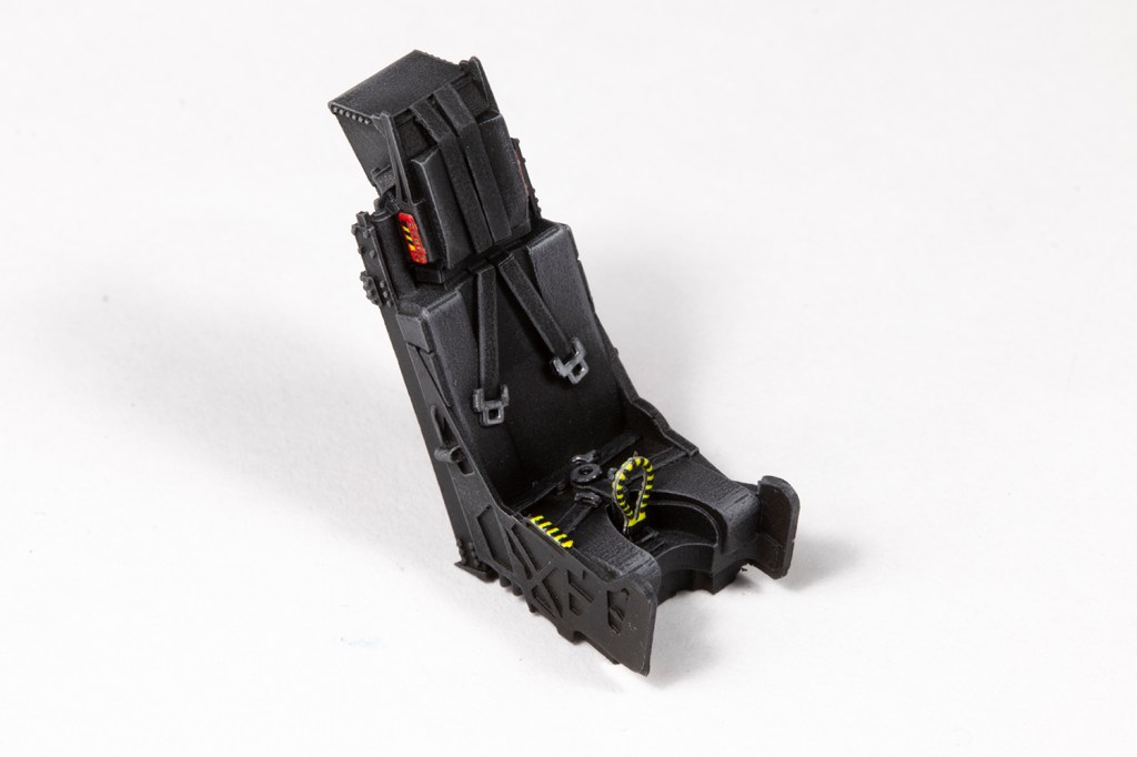 I ignored the Wolfpack PE for the interior as I preferred to paint the nice raised detail moulded by Trumpeter. It was, however, useful to replace the HUD along with some supplied acetate screens. The Trumpeter kit does include a PE fret for the HUD, instrument panel coaming and seat belts, but the Wolfpack items are just better. The resin seat is very simple and mostly just black. As always, the end result is highly simplified compared to the real thing, but under a closed canopy looks busy enough. You should definitely test fit the HUD under the windscreen – there’s not much clearance!