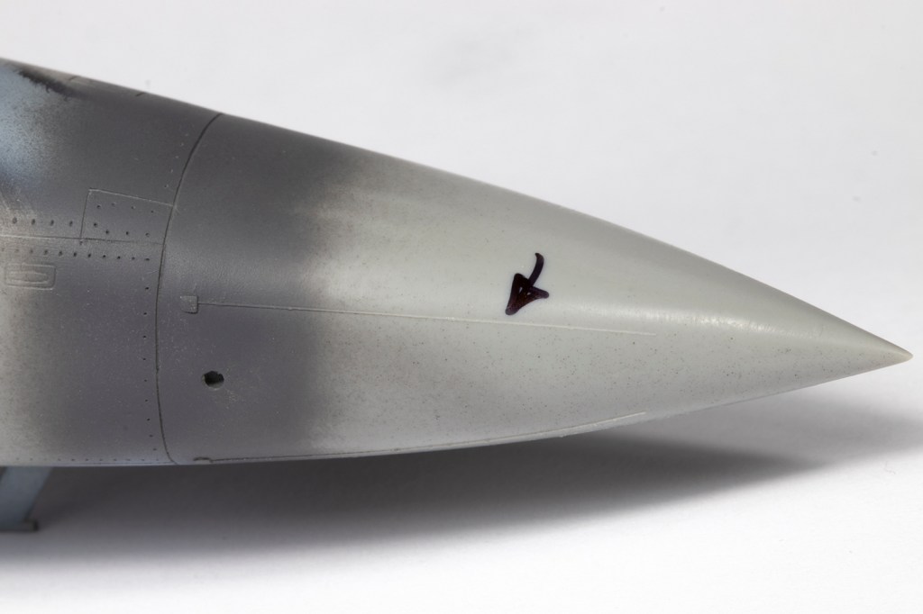 My final additions were the multitude of pitots superglued in place around the nose (and the little inevitable glue spots matted down with a quick spurt of VMS Flat) and the addition of a small black aerial behind the canopy, although it’s way too big, and a bit too far aft.